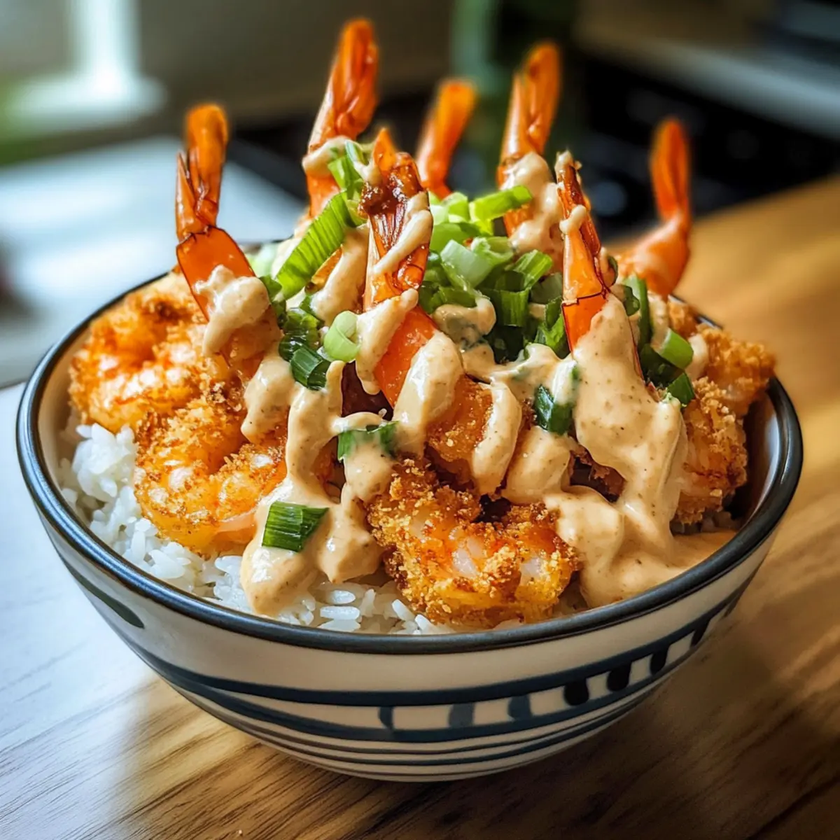 Kocht den Jasminreis nach Packungsanweisung und verteilt ihn gleichmäßig auf Tellern. Legt die frisch frittierten Garnelen darauf und träufelt großzügig die Bang Bang Sauce darüber. Als letzte kreative Note mit frisch geschnittenen Frühlingszwiebeln garnieren und sofort servieren. Diese Bang Bang Garnelen Reis Schüssel wird jeden begeistern!