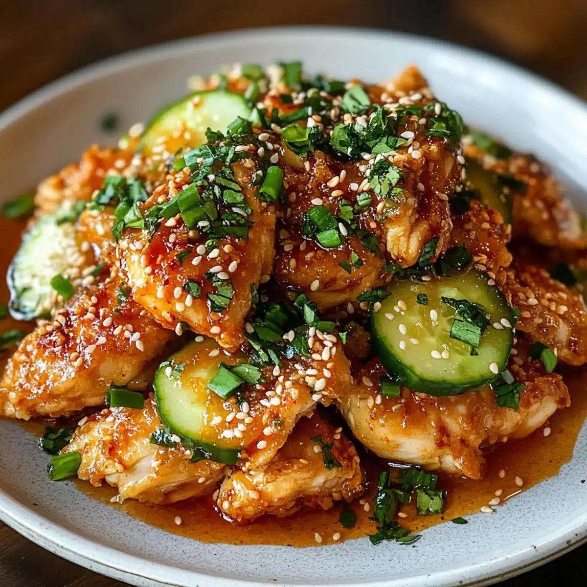 Asiatischer Gurkensalat: Dieser leichte, knusprige Salat mit frischen Kräutern bringt einen zusätzlichen Frischekick, der das Huhn wunderbar ergänzt. Seine knackige Textur harmoniert auch toll mit der zarten Chicken-Konsistenz.
