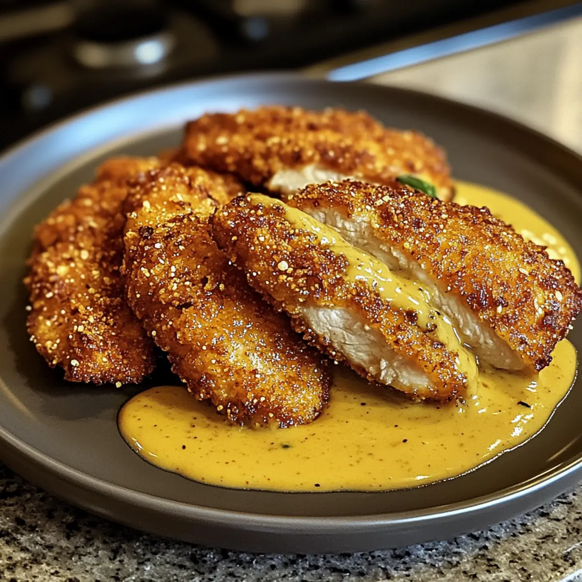 Brezelkrusten-Hühnchen mit Cheddar-Senfsauce genießen