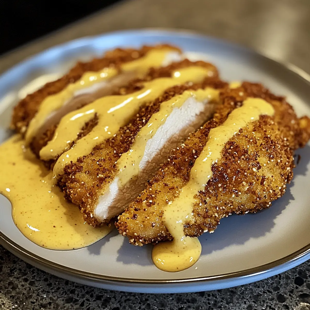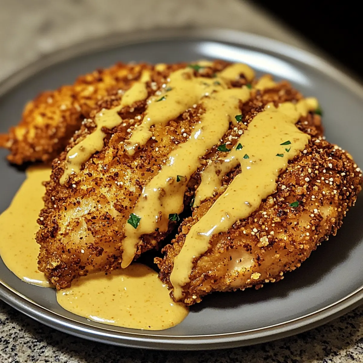 Lege das Brezelkrusten-Hühnchen auf Teller und gieße die warme Cheddar-Senfsauce großzügig darüber. Garniere mit frischer Petersilie für eine ansprechende Optik. Dieses Gericht ist nicht nur ein Genuss für den Gaumen, sondern auch ein Augenschmaus, der die ganze Familie begeistert.