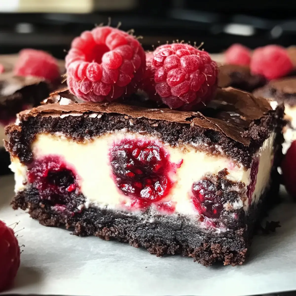 Leckerer Brownies mit Cheesecake und Himbeeren