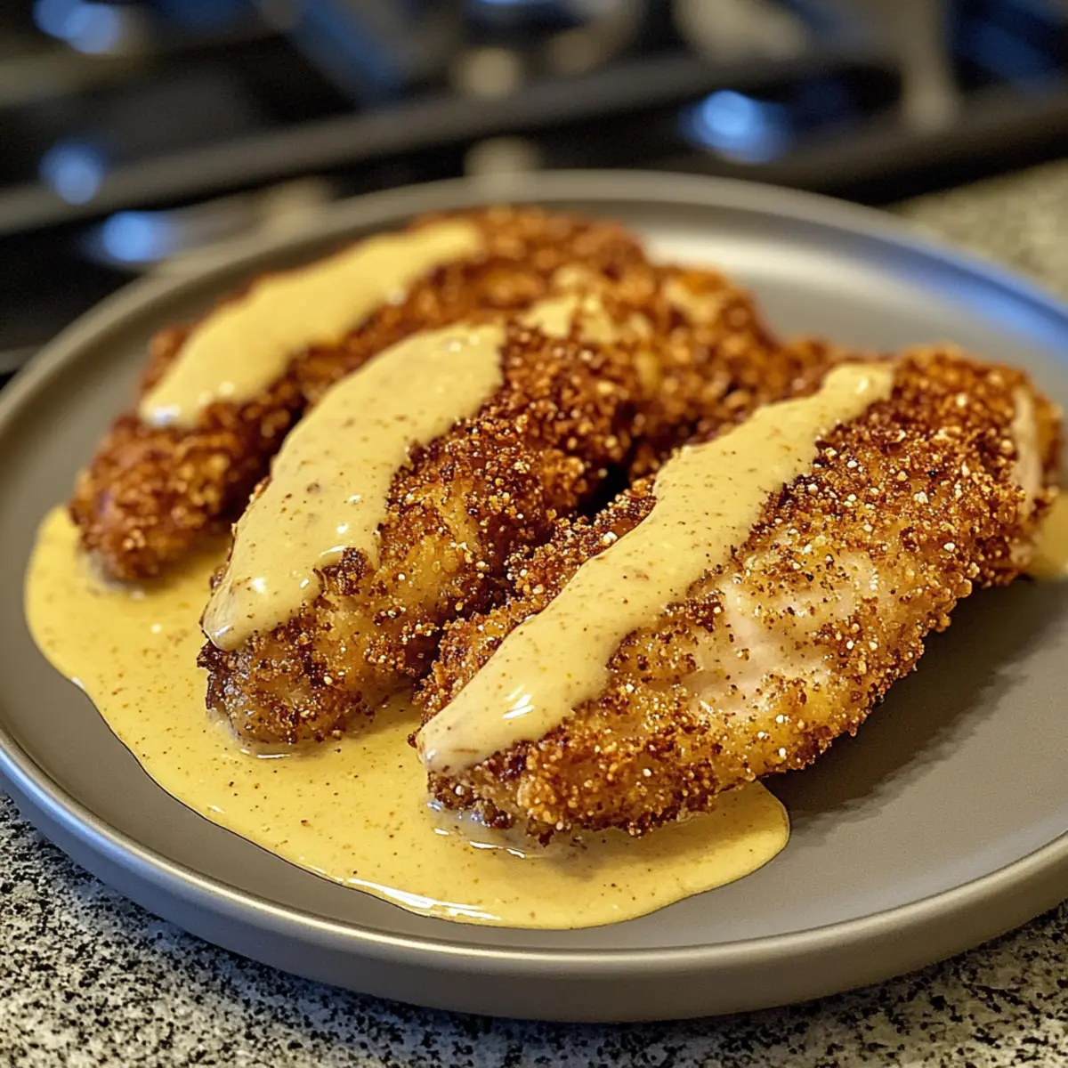 Brezelkrusten-Hühnchen mit Cheddar-Senfsauce genießen