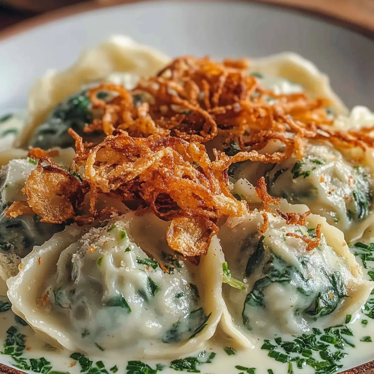Cremige Spinat-Ravioli mit Röstzwiebeln Genuss