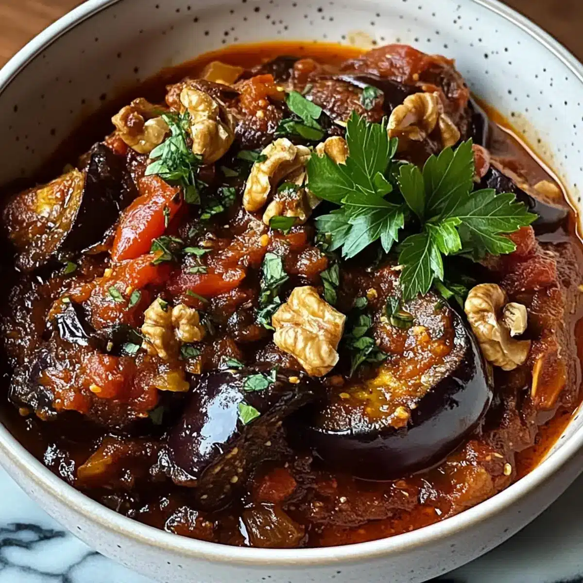 Gewürzter Auberginen- und Walnuss-Eintopf genießen