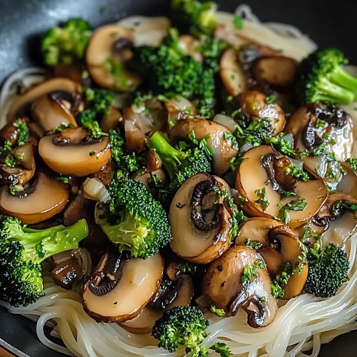 Pilz und Brokkoli in gebratenem Reis-Nudeln genießen