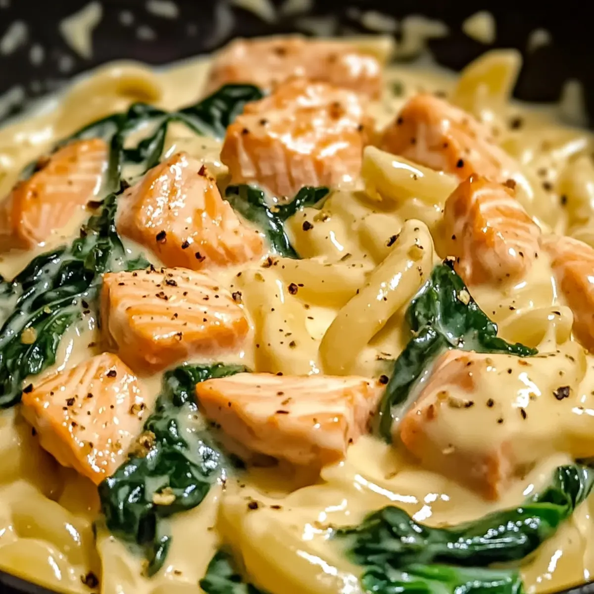 Pasta in Lachssahnesoße und Spinat schnell zubereiten