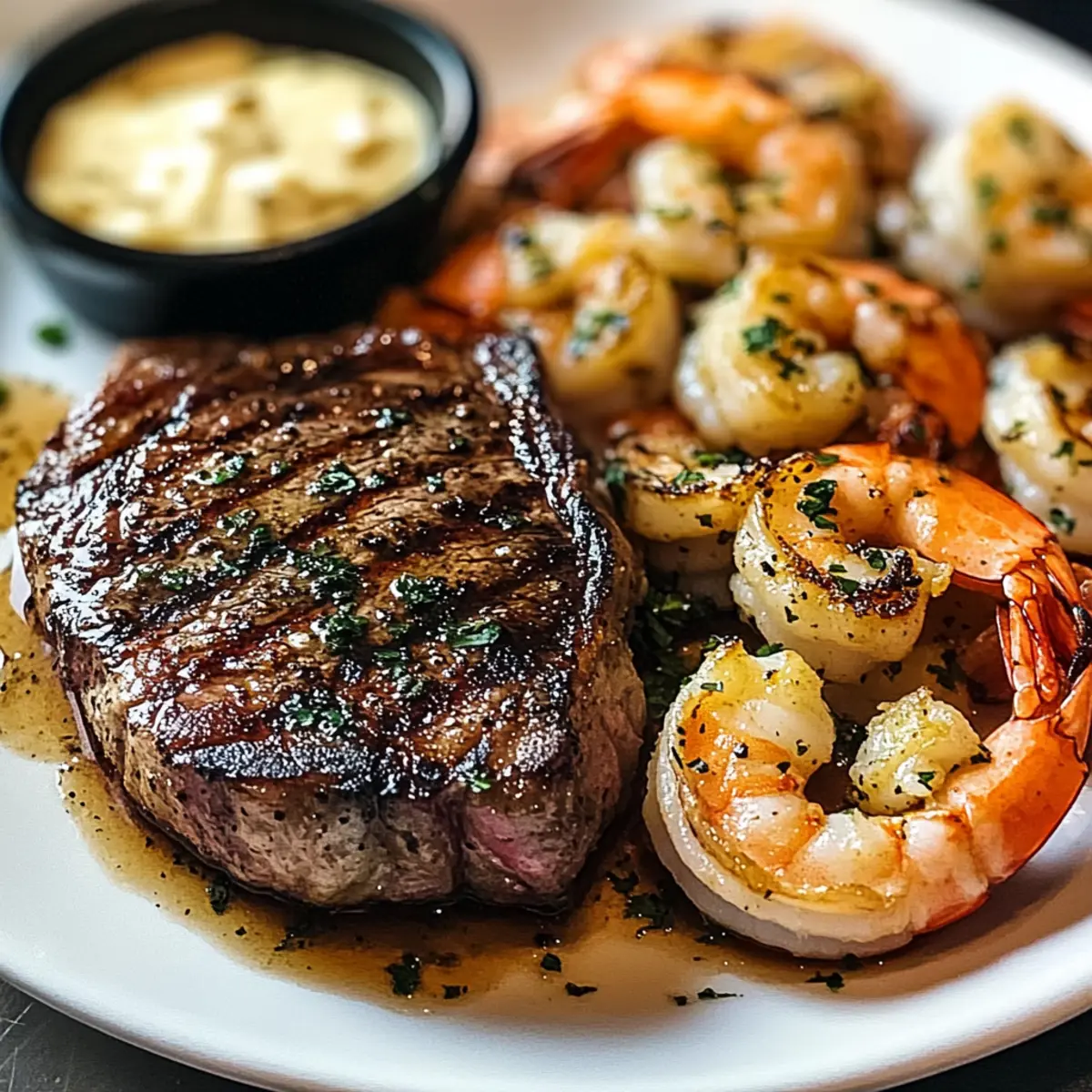 Knoblauchbutter Grillsteak und Garnelen für Feinschmecker