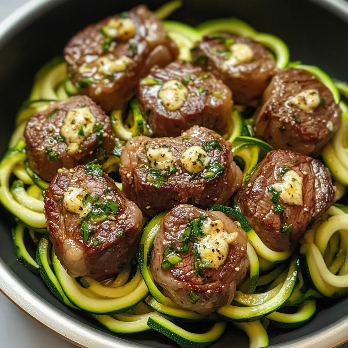 Knoblauchbutter Steakbisse mit Zucchini-Nudeln