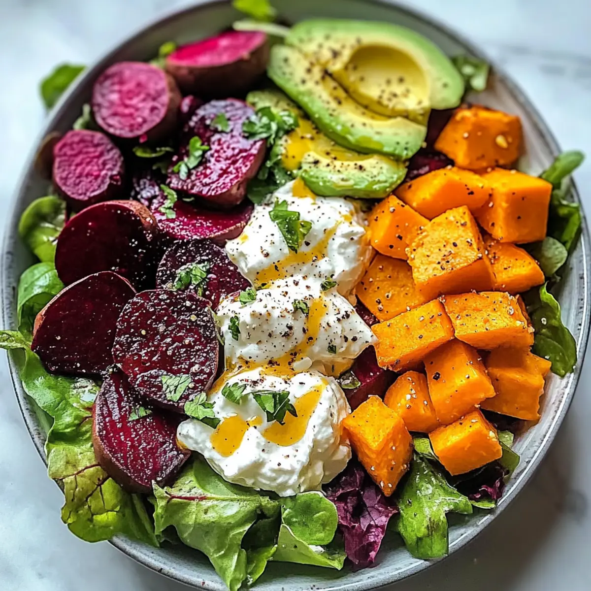 Süßkartoffel-Avocado-Salat mit Rote Bete und Ricotta