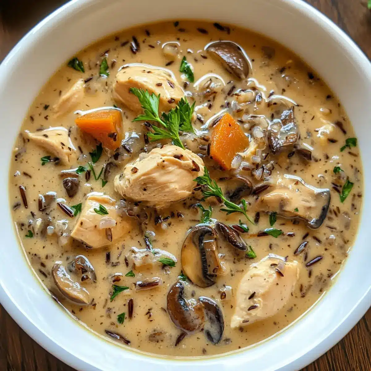 Cremige Pilz-Hühnchen- und Wildreis-Suppe für Genuss