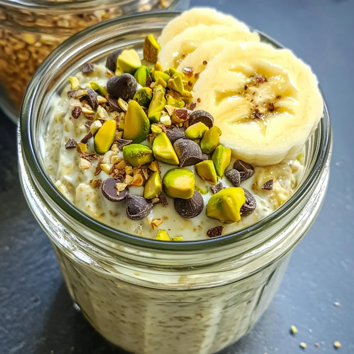Vor dem Servieren die Portionen nach Belieben mit gehackten Pistazien, in Scheiben geschnittenen Bananen und dunklen Schokoladensplittern garnieren. Fügen Sie die frischen Bananen am besten erst am Tag des Verzehrs hinzu, um die beste Textur zu gewährleisten. Dies sorgt für zusätzliche Frische und einen köstlichen Crunch.
