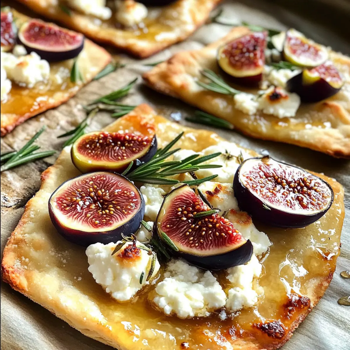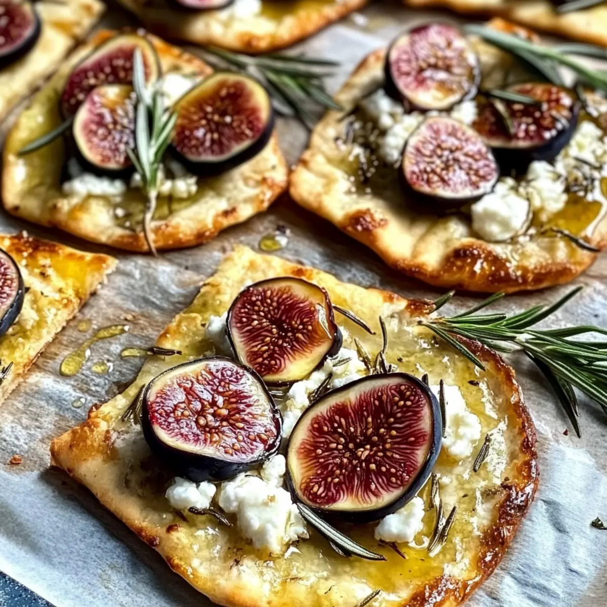 - Die Feigen in dünne Scheiben schneiden und gleichmäßig auf jeden Fladen verteilen. Mit Schafskäse und Rosmarin garnieren.