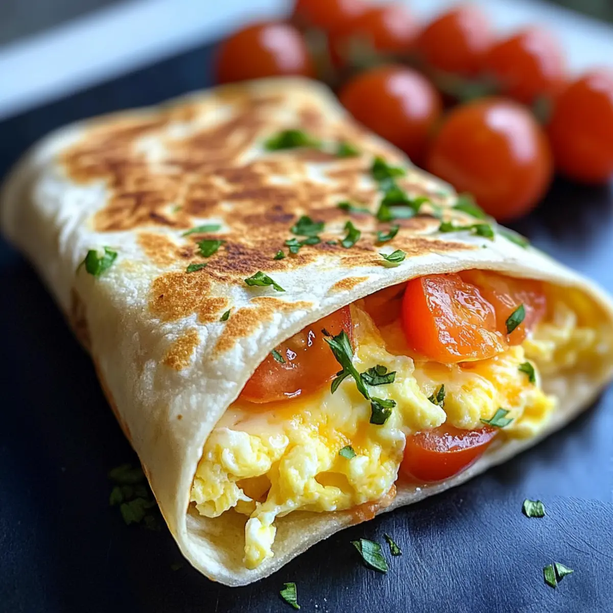 Genieße diesen Frühstückswrap mit Ei, Käse und Tomaten als schnellen und schmackhaften Start in den Tag!