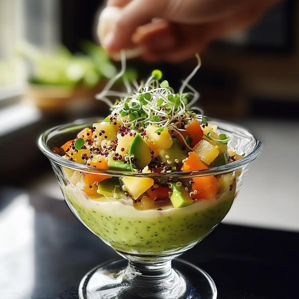 Die vorbereiteten Gemüse gleichmäßig in servierfähige Gläser oder Schalen füllen. Dann großzügig mit der Tigermilch übergießen, sodass das Gemüse etwa ein Drittel der Höhe bedeckt ist. Vor dem Servieren mit den Sprossen und dem gerösteten Quinoa garnieren, um das Gericht anzurichten und eine beeindruckende Präsentation zu erzielen.