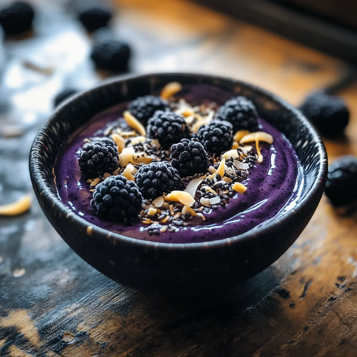 - Dekorieren der Schüssel: Die Brombeeren und die geröstete Kokosnuss gleichmäßig über die Basis streuen.
