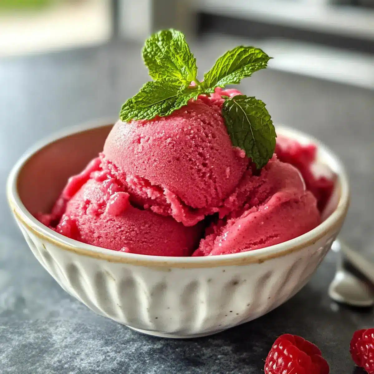 Genießen Sie dieses köstliche Himbeer-Sorbet, das einfach zuzubereiten und perfekt für heiße Tage ist!