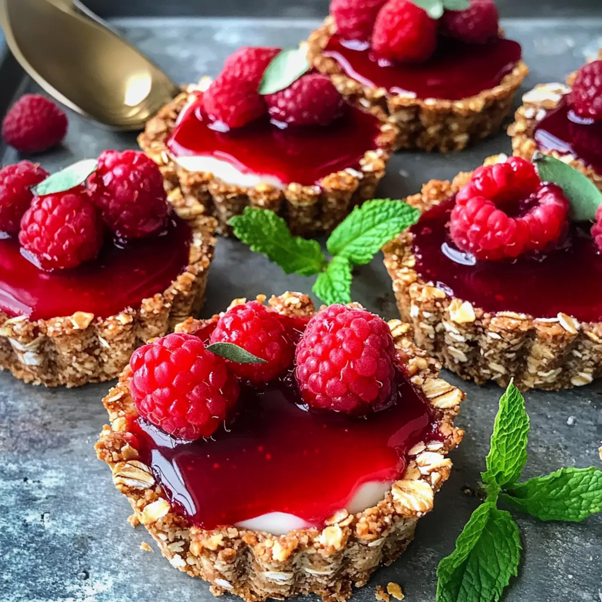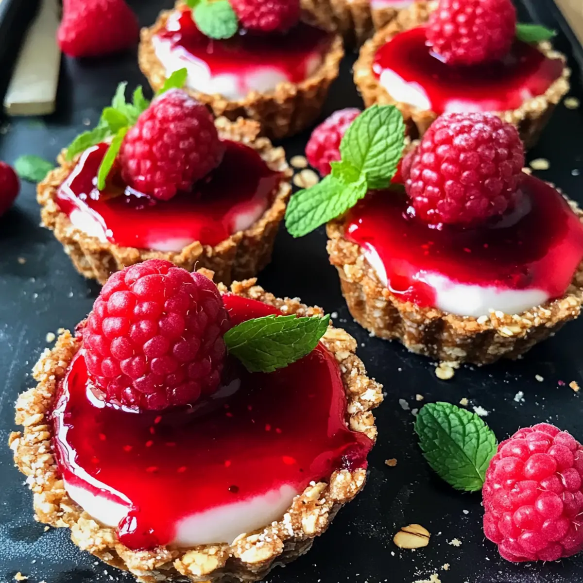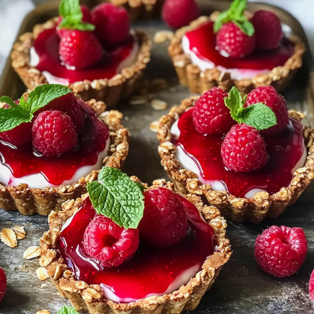 - Gieße die gekühlte Himbeersauce über die Tartlets.