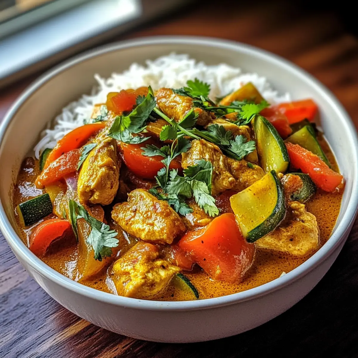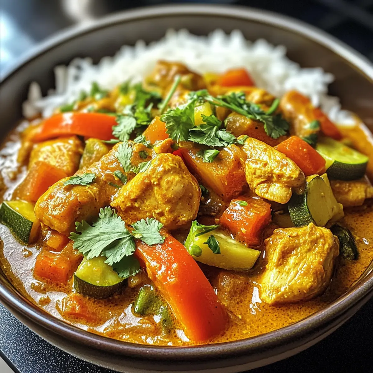 - Das Curry heiß servieren, mit frischem Koriander garnieren und zusammen mit dem locker gegarten Basmatireis genießen.