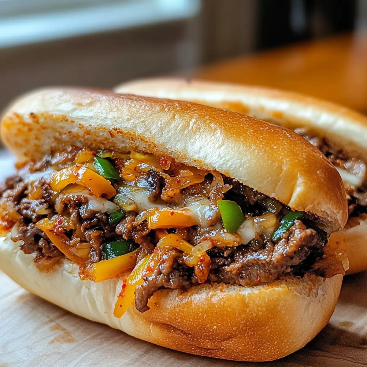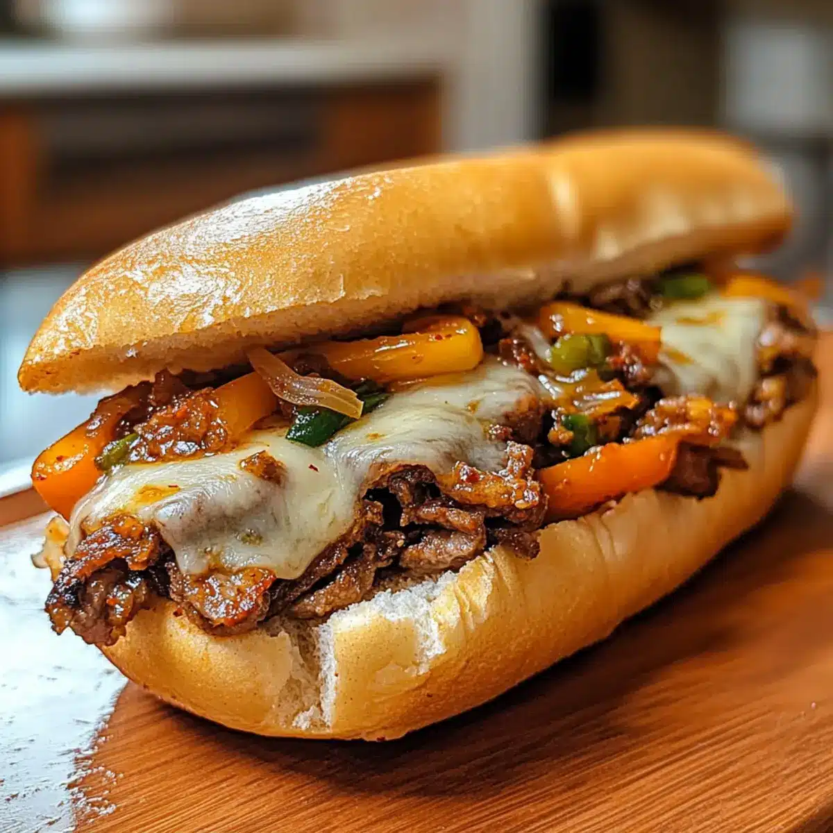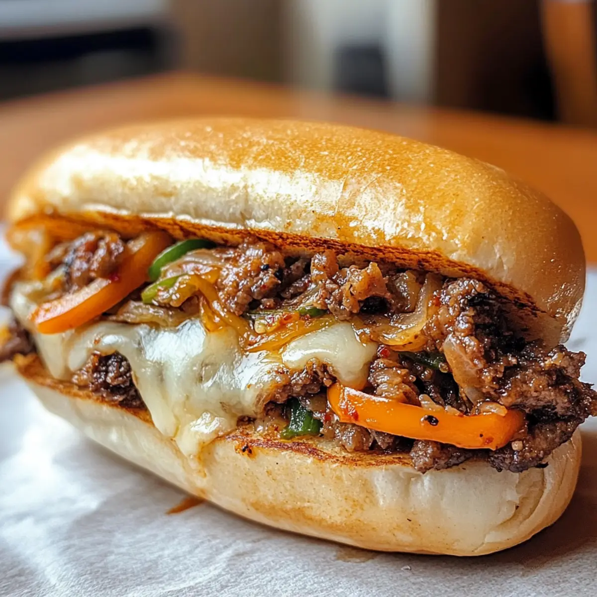 Köstlicher Genuss: Kombiniert mit schmelzendem Käse und frisch geröstetem Brot, bietet dieser Cheesesteak eine unwiderstehliche Textur.