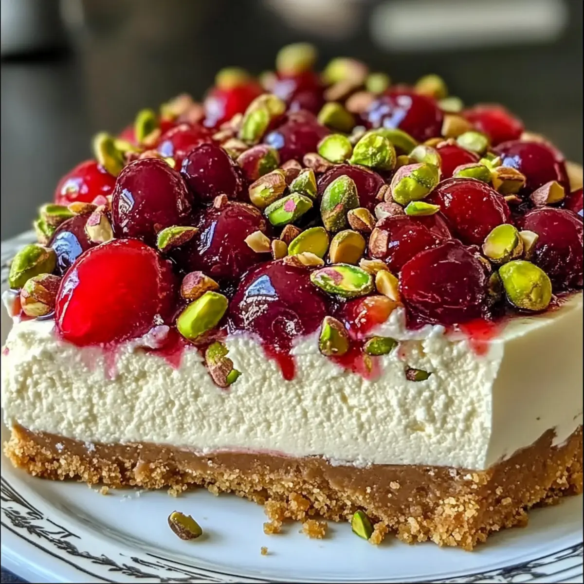 - Verteile die Kirschen über den gekühlten Käsekuchen und garniere mit gehackten Pistazien.