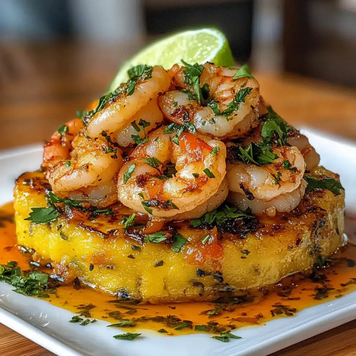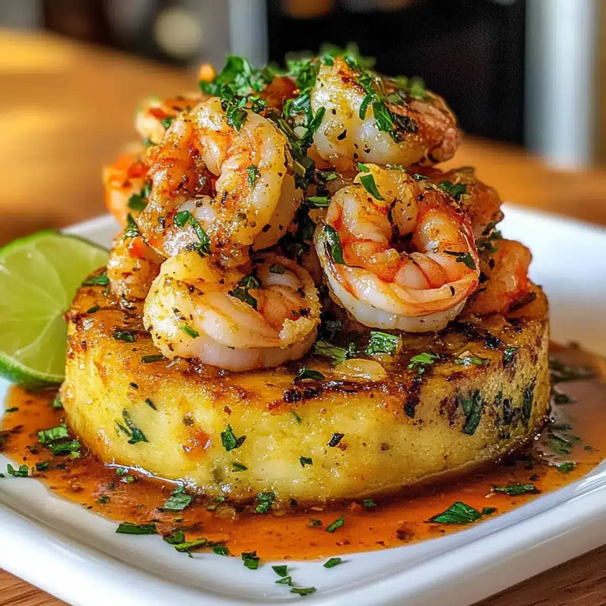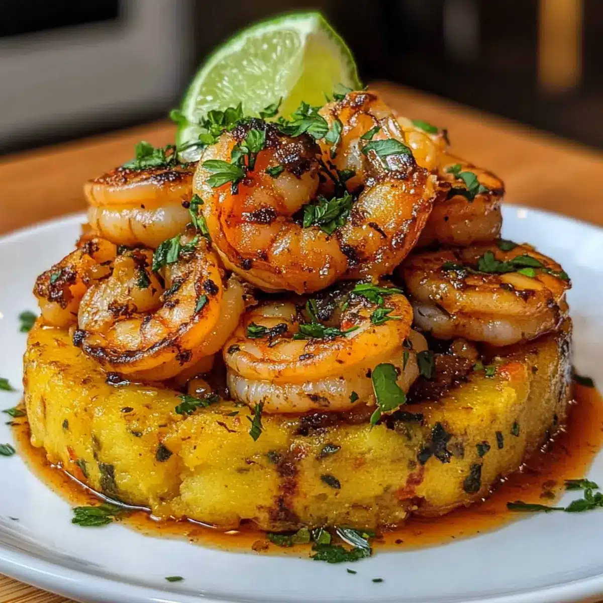 - Nehme eine Portion des Mofongo, forme sie auf einem Teller, platziere die Garnelen darauf und garniere nach Belieben.