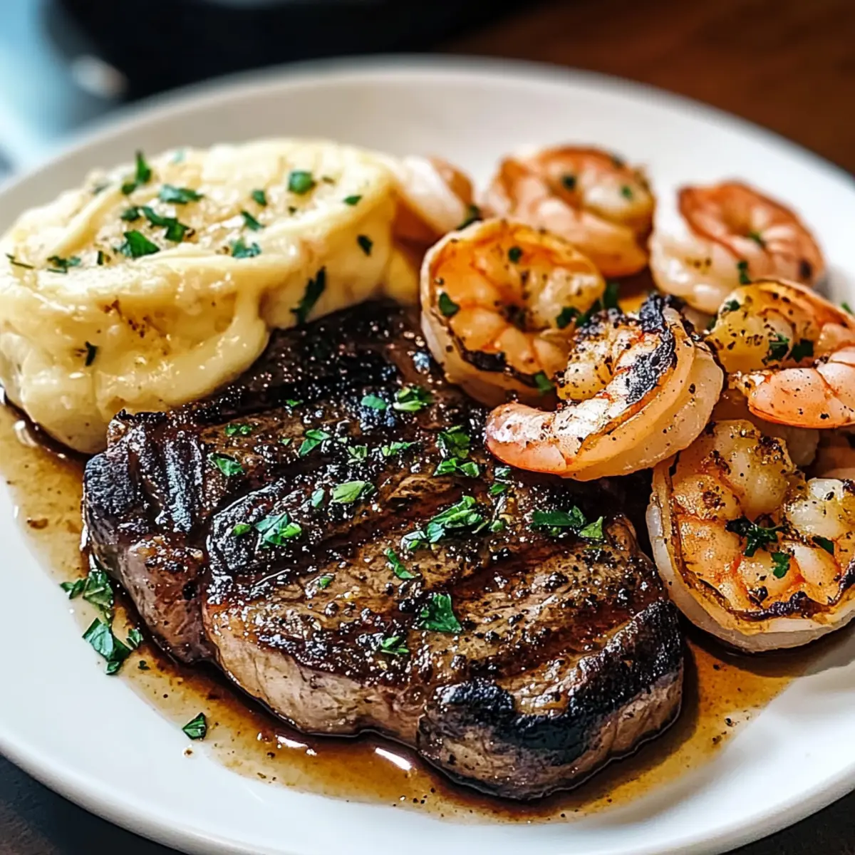 Perfekte Texturen: Die krustige Oberfläche des Steaks und die zarten, saftigen Garnelen sorgen für ein harmonisches Mundgefühl, das jeden Bissen zu einem Erlebnis macht.