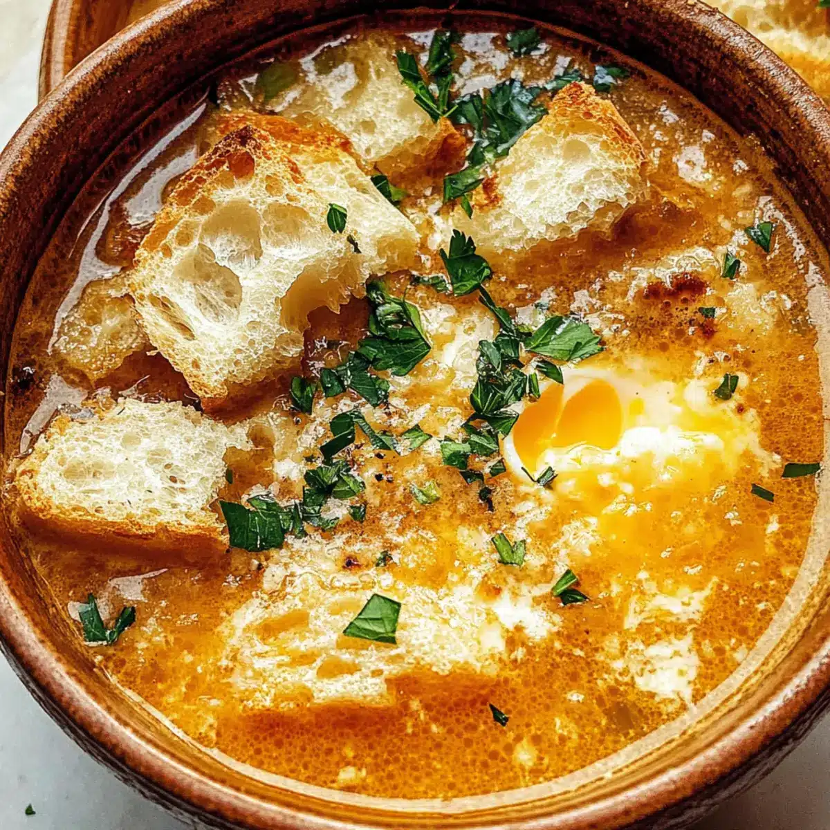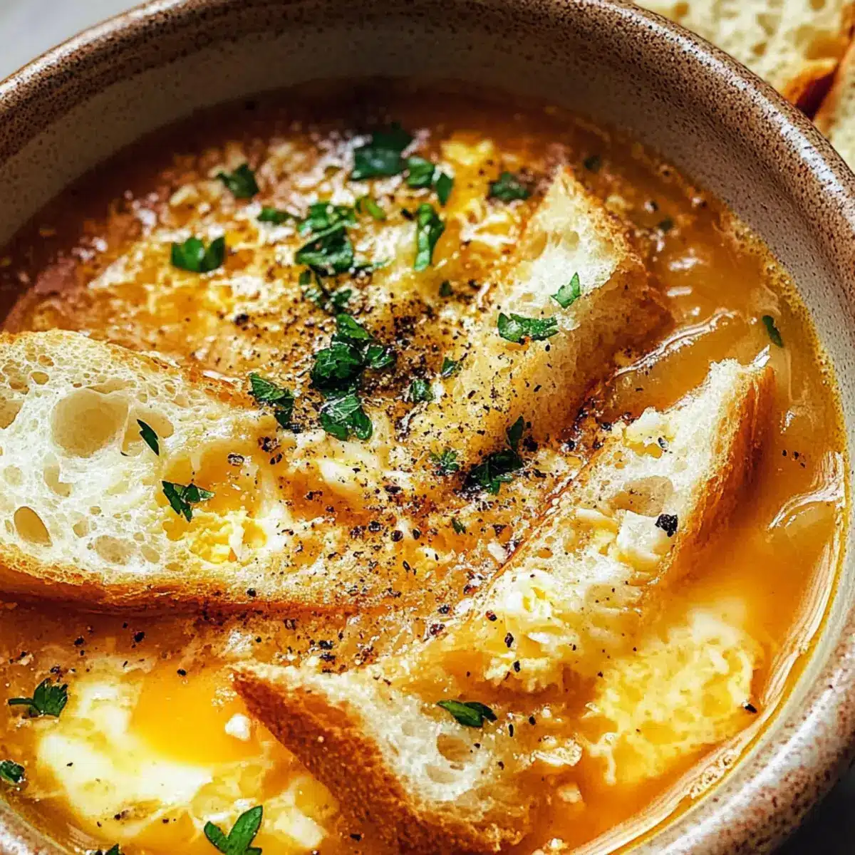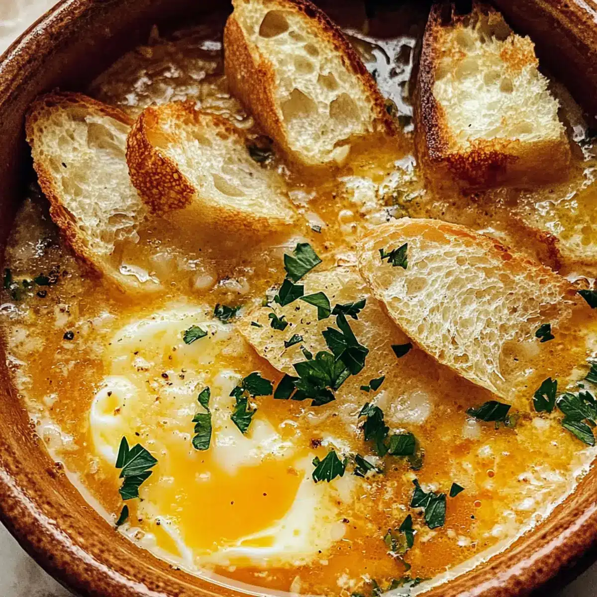 Erzeuge mit einem Holzlöffel einen kleinen Strudel in der Suppe und gieße langsam die verquirlten Eier hinein, während du sanft umrührst. So entstehen zarte Eirippchen, die deiner Knoblauchsuppe eine wunderbare Textur geben. Lasse die Suppe für etwa 1 Minute weiter köcheln, bis die Eier vollständig gegart sind.