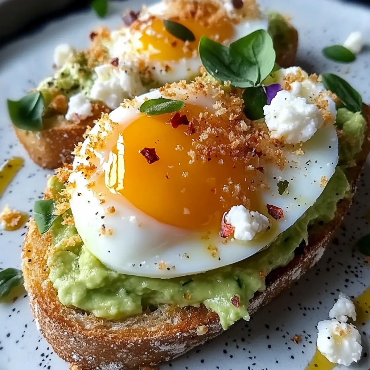 Lege die knusprig panko panierten Eier auf eine Scheibe geröstetes Brot, das bereits mit frisch zerdrückter Avocado belegt ist. Bestreue die Eier mit zerbröckeltem Feta-Käse, einer Prise Chili-Flocken und grobem Meersalz für das perfekte Finish. Genießen und frohlocken!