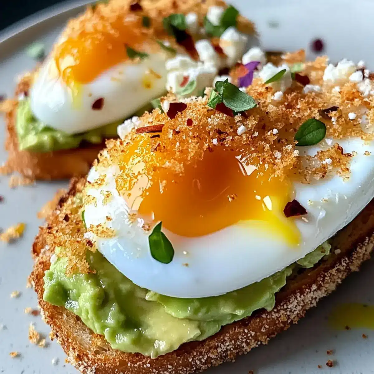 Genieße die knusprig panko panierte pochierte Eier auf Avocado Toast und lasse dich von diesem köstlichen Frühstück verzaubern!