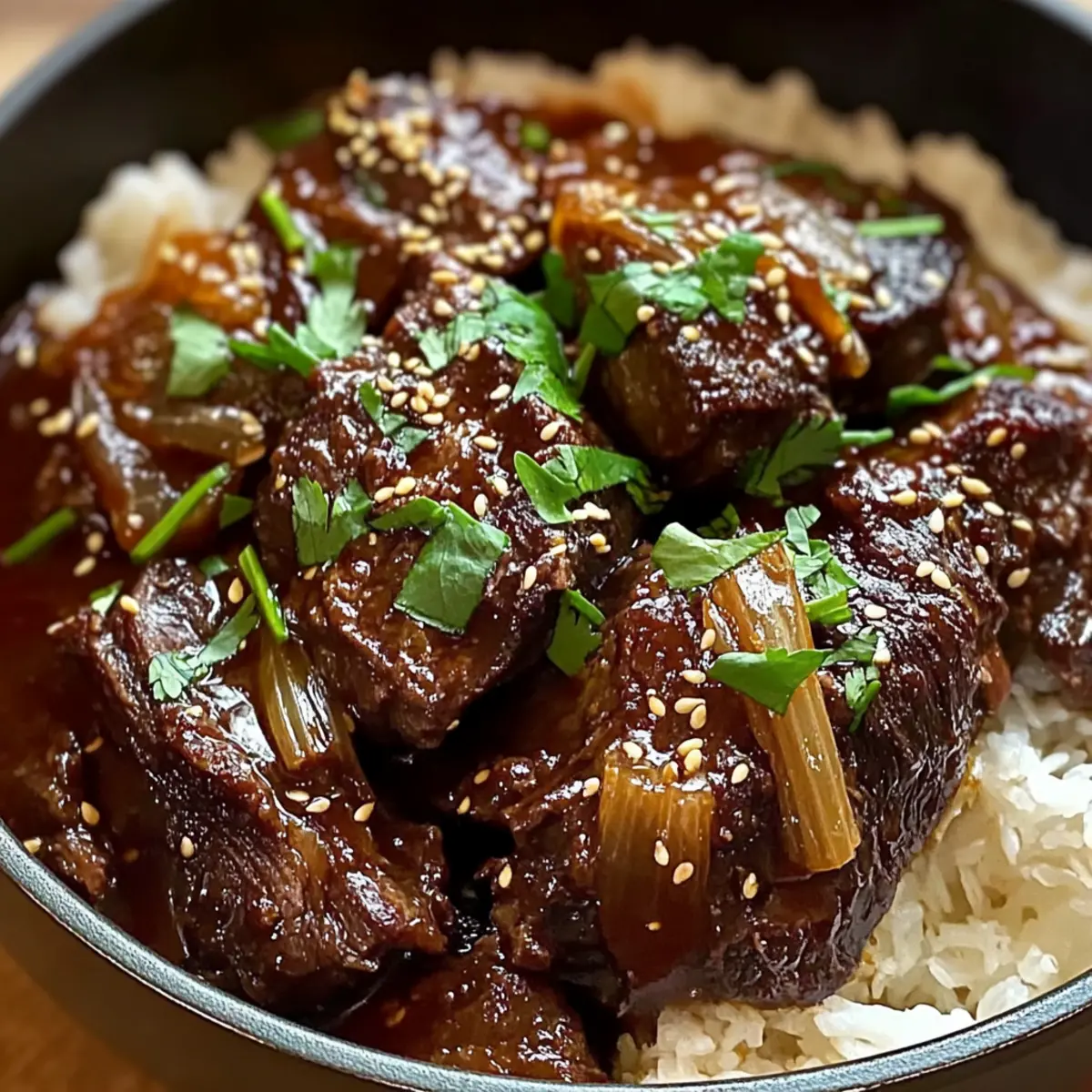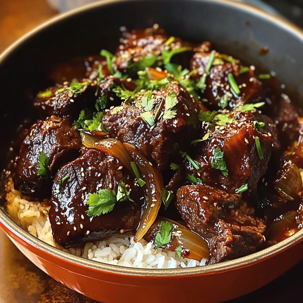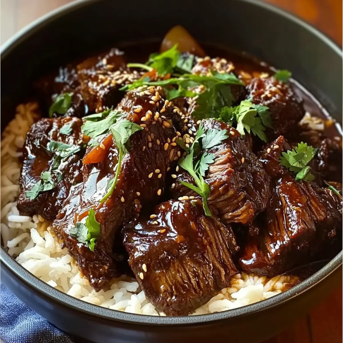 - Den Schmorbraten warm über gekochtem Reis servieren und mit frischem Koriander garnieren.