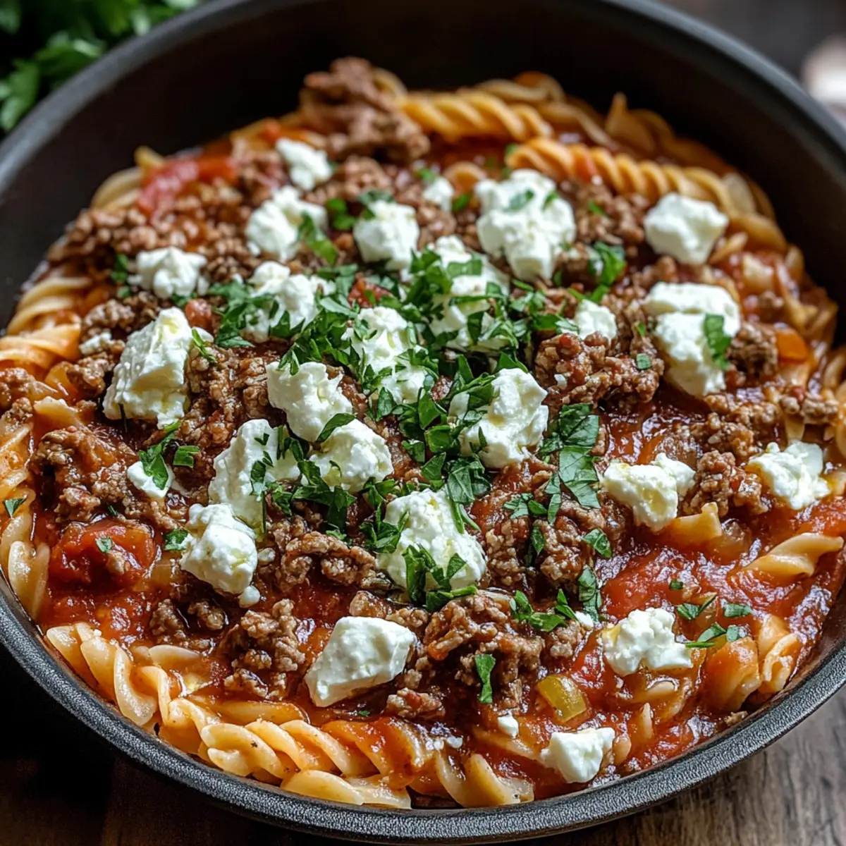 Garnieren Sie die Kritharaki-Hackfleischpfanne mit frisch gehackter Petersilie, wenn gewünscht. Servieren Sie das Gericht heiß zusammen mit einem frischen Salat für einen schönen Kontrast. Ihre köstliche Kritharaki-Hackfleischpfanne mit Feta ist nun bereit für den Tisch!