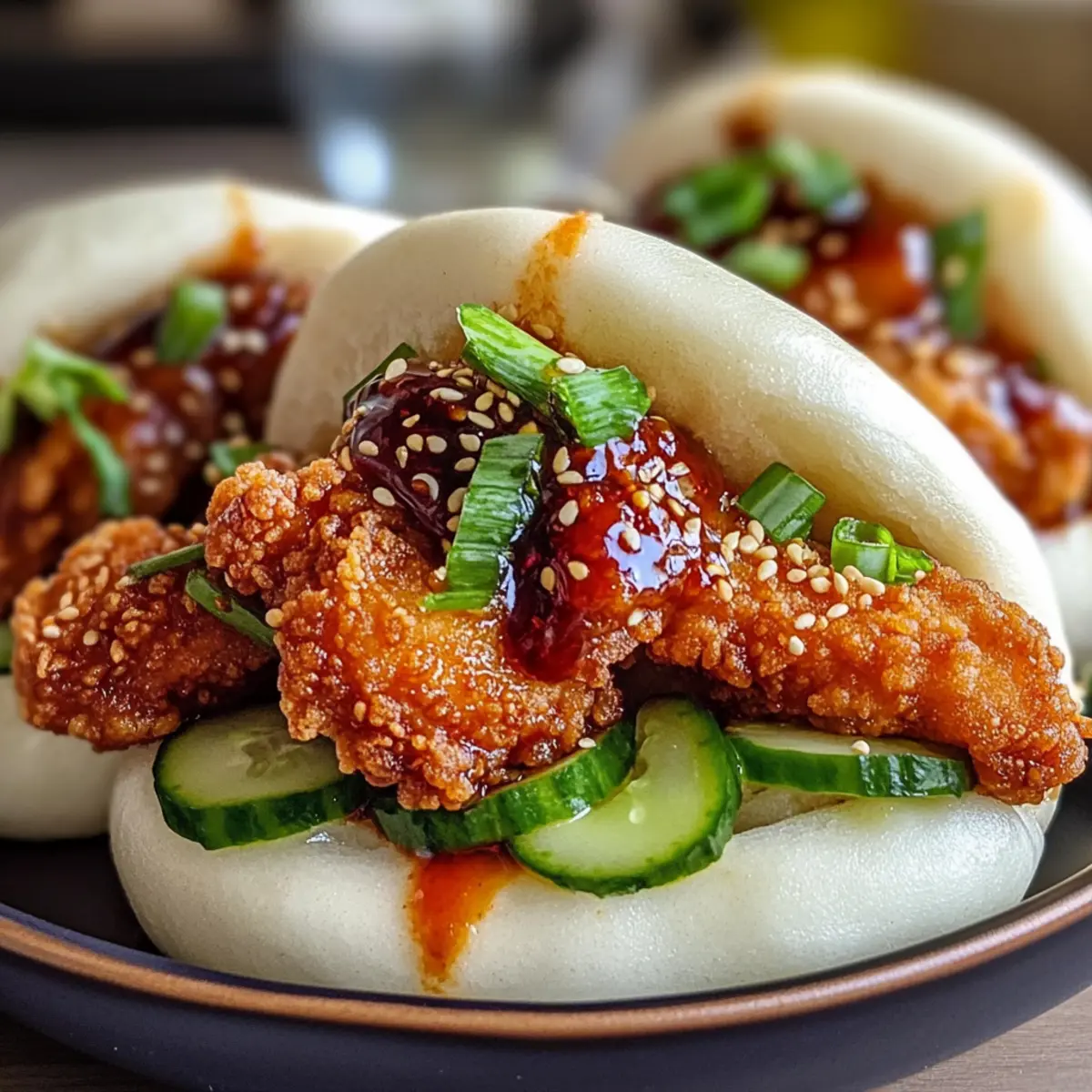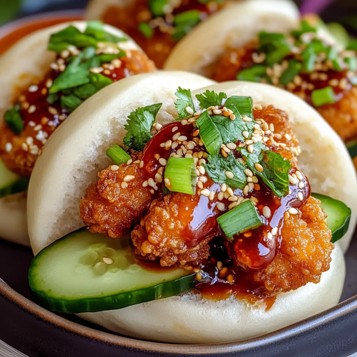 - Servieren und genießen: Krosse Hähnchen-Bao-Brötchen auf einem Teller anrichten.
