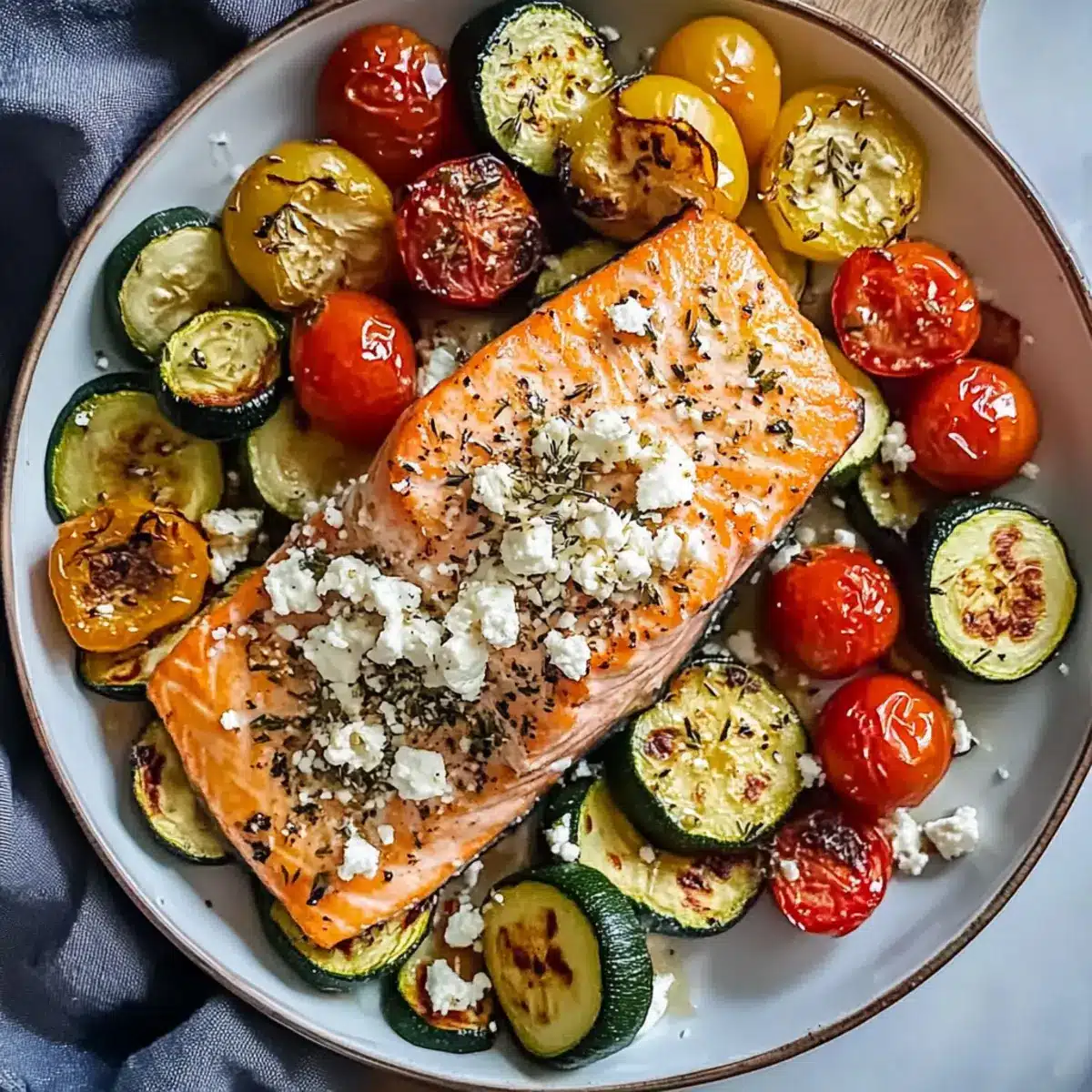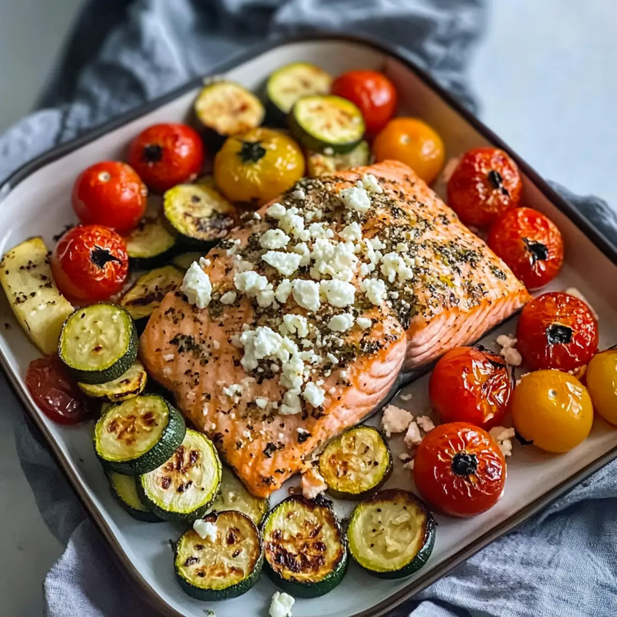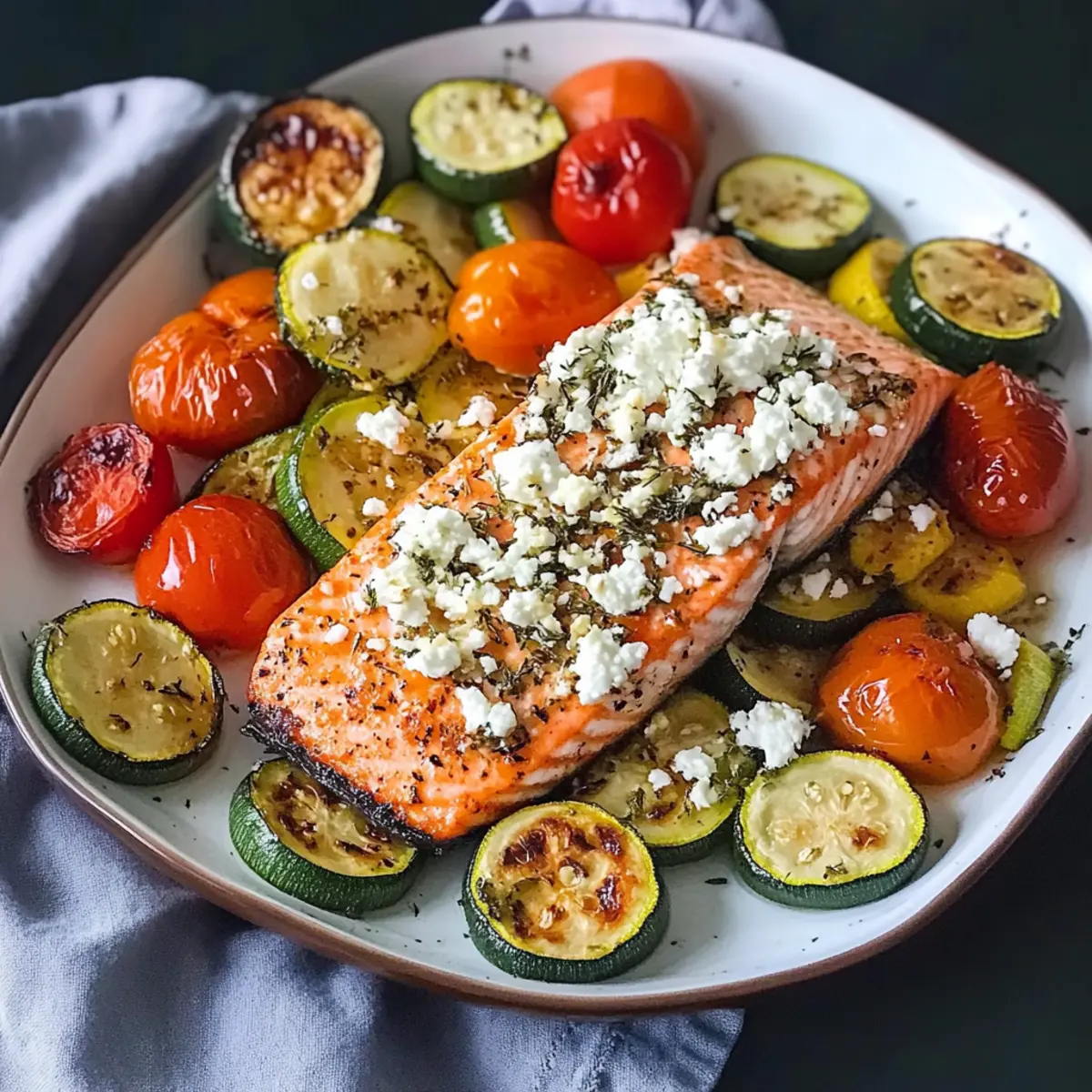 Du möchtest gesunde Mahlzeiten zeitsparend vorbereiten? Mit dem Lachs mit geröstetem Gemüse ist das ein Kinderspiel! Du kannst das gesamte Gemüse (Zucchini, Champignons, Paprika und Tomaten) bereits bis zu 24 Stunden im Voraus schneiden und in einem verschlossenen Behälter im Kühlschrank aufbewahren. Auch den Lachs kannst du würzen und vorbereitet lagern, so bleibt er frisch und geschmackvoll. Wenn du bereit bist zu kochen, heize einfach den Ofen vor, schichte das Gemüse und den Lachs in die vorbereitete Folienform, füge den Feta hinzu und backe alles für etwa 30–35 Minuten. So gelingt dir eine köstliche, nährstoffreiche Mahlzeit mit minimalem Aufwand – perfekt für deine stressigen Wochentage!