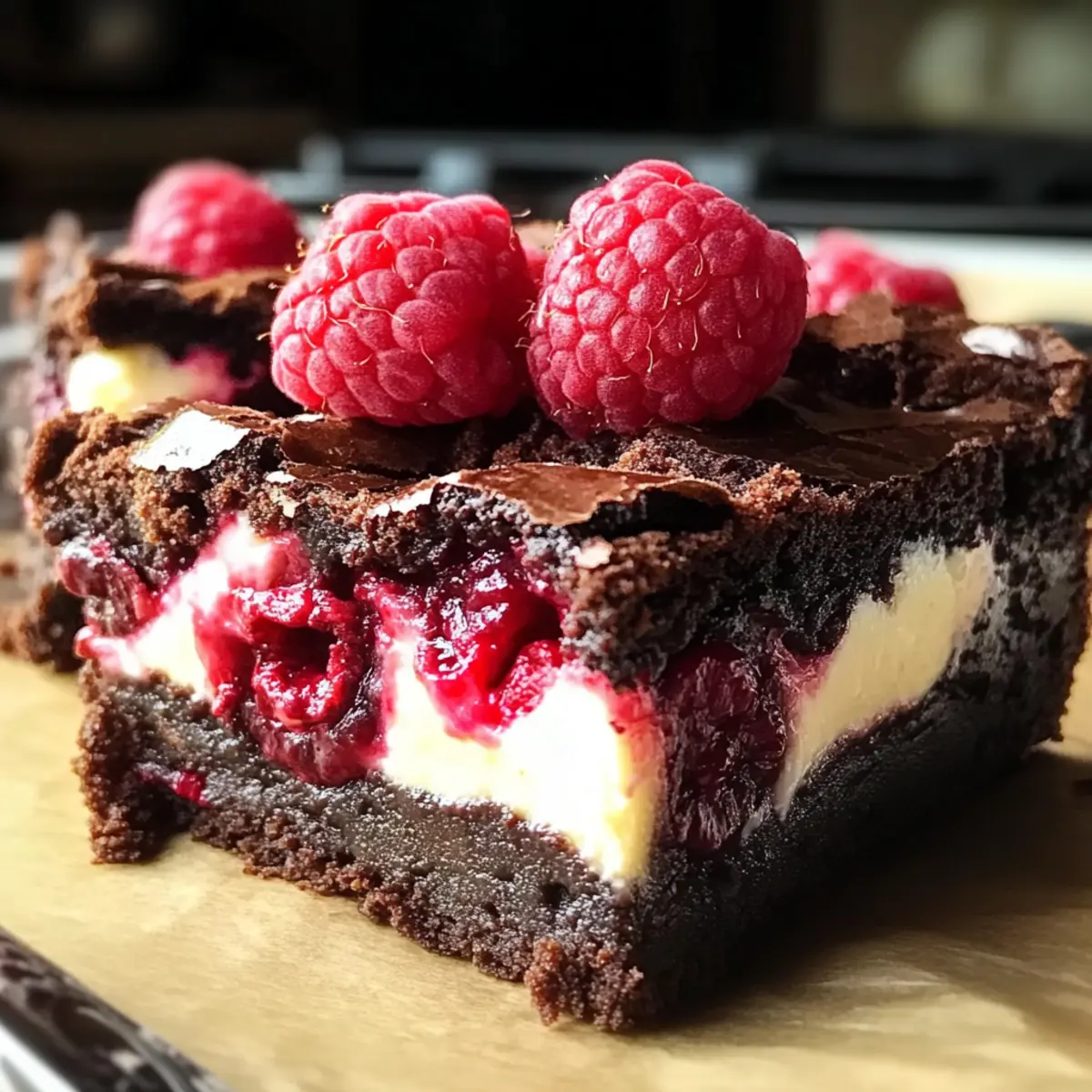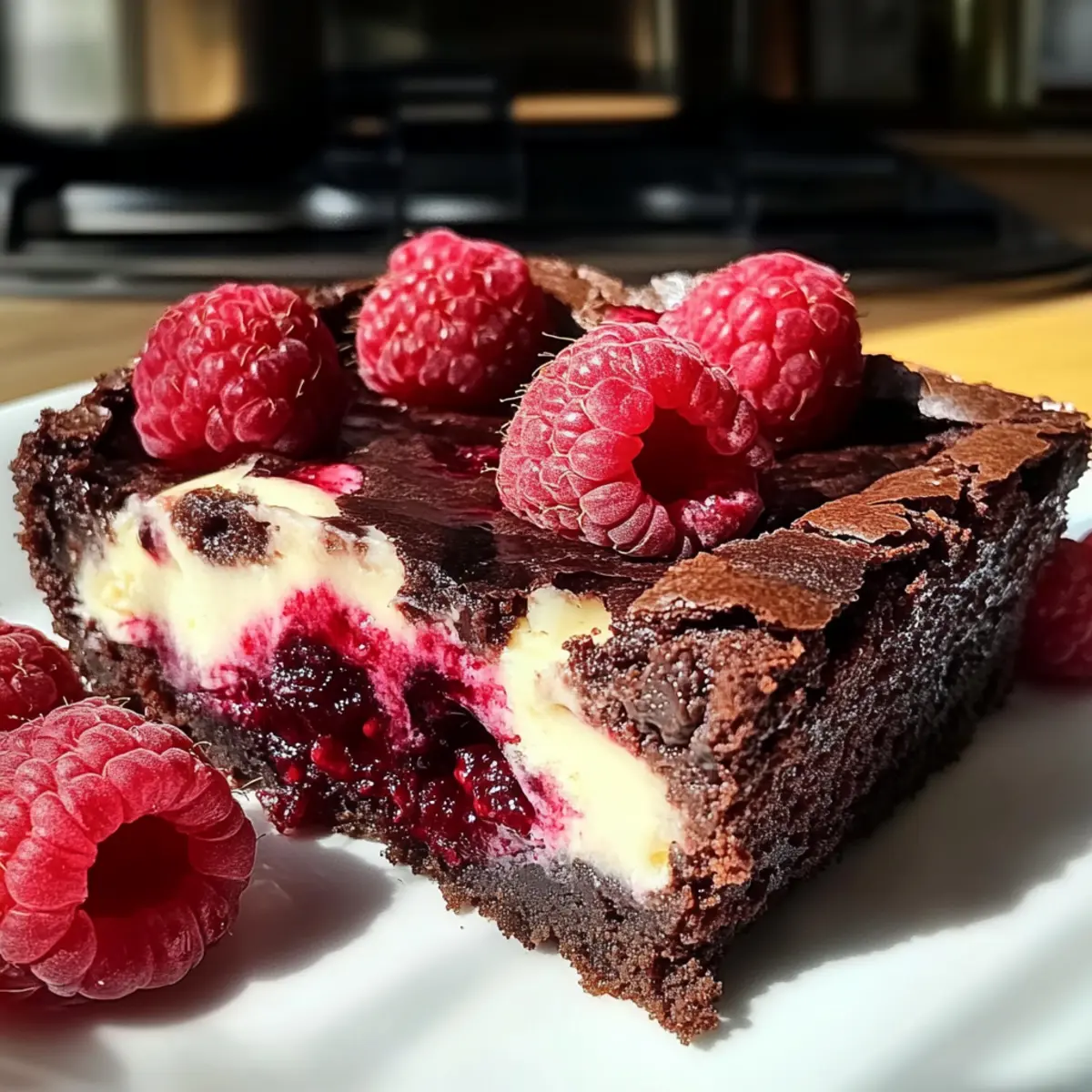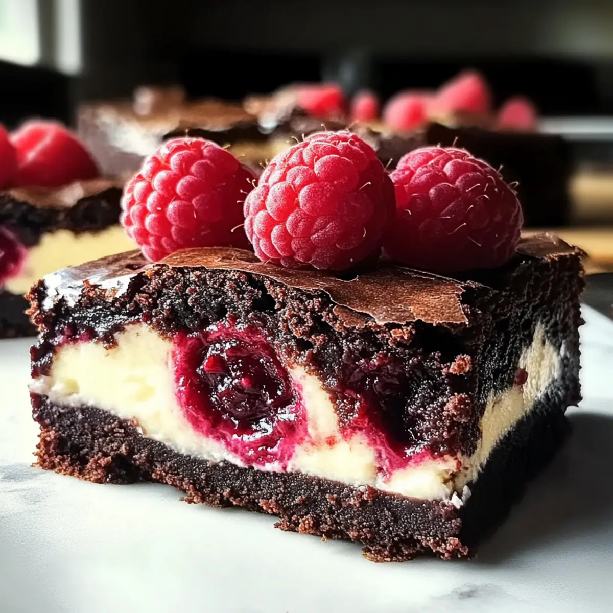 Leckerer Brownies mit Cheesecake und Himbeeren