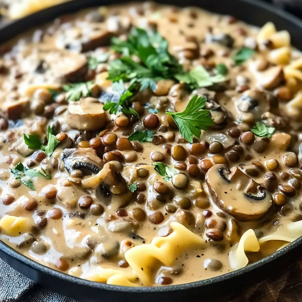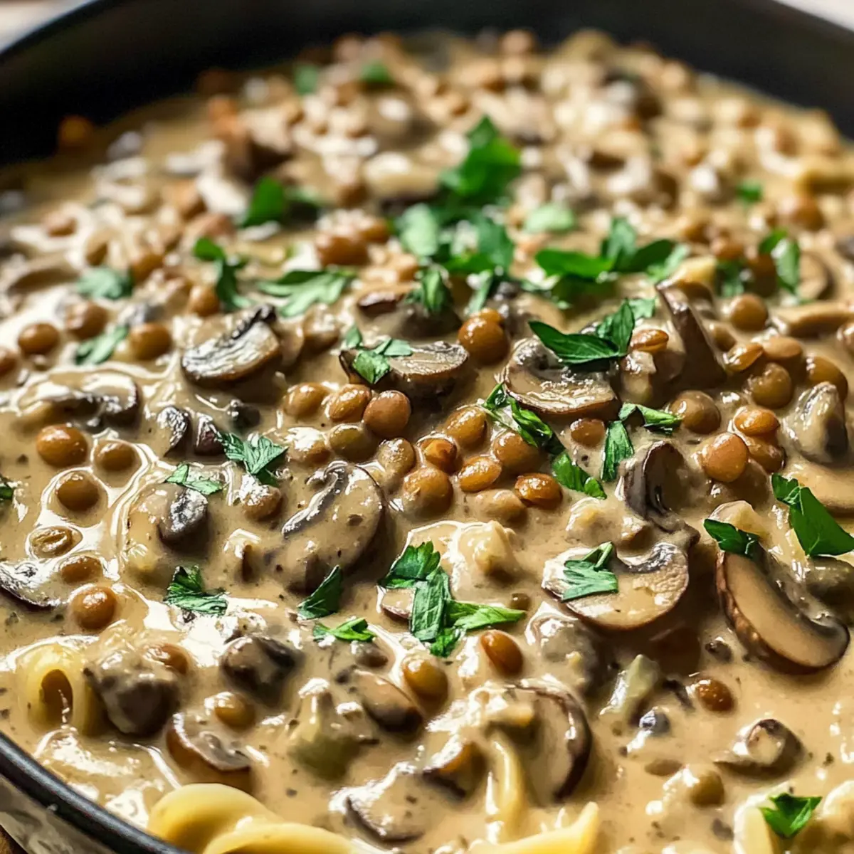 Perfekte Konsistenz: Die cremige, samtige Sauce umhüllt die Linsen und Pilze und zaubert ein Gefühl von Komfort auf den Teller.