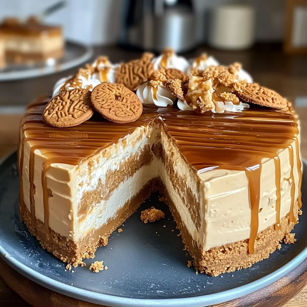 Beeindruckendes Aussehen: Die glänzende Karamellschicht und die dekorativen Kekse machen diesen Käsekuchen nicht nur köstlich, sondern auch zu einem visuellen Höhepunkt auf jedem Tisch!