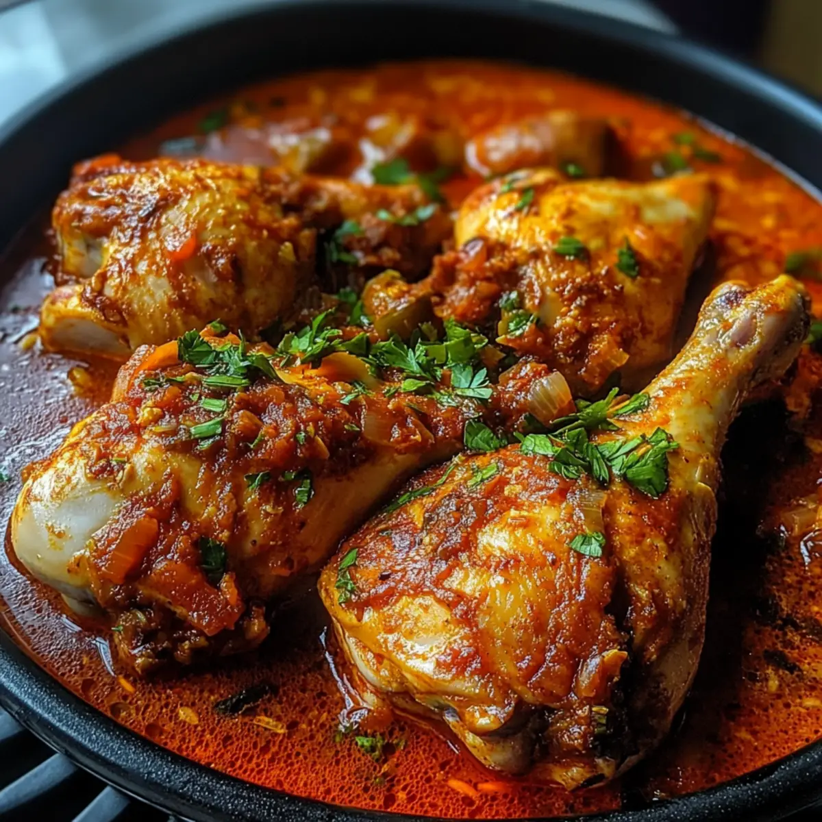 Eines der besten Dinge am Kochen ist, wie es uns an ferne Orte entführt, ohne das Haus zu verlassen. Wenn ich an die lebendige Küche Nigerias denke, fließen Erinnerungen an die aufstrebenden Aromen und herzlichen Zusammenkünfte. Der Nigerianische Hähncheneintopf ist der Inbegriff dieser Erfahrung – zartes Hähnchen, das in einer kräftigen Tomaten-Pfeffer-Sauce köchelt, die alle Sinne verführt. Dieses Rezept liefert nicht nur eine unkomplizierte Zubereitung, sondern ist auch ein wahrer Genuss für die Seele und macht jede Mahlzeit zu etwas Besonderem. Egal ob für Familienfeiern oder gemütliche Abende, dieser Eintopf bringt Freude auf jeden Tisch. Neugierig, wie du dieses köstliche Gericht zubereiten kannst?