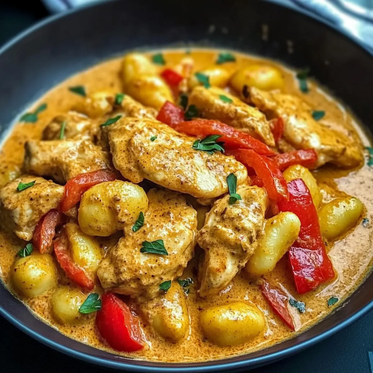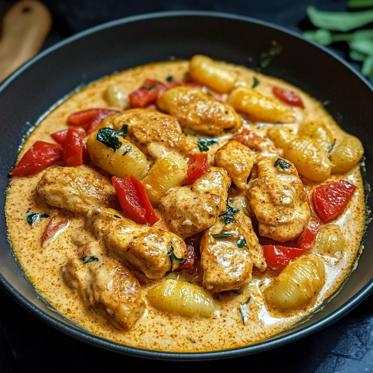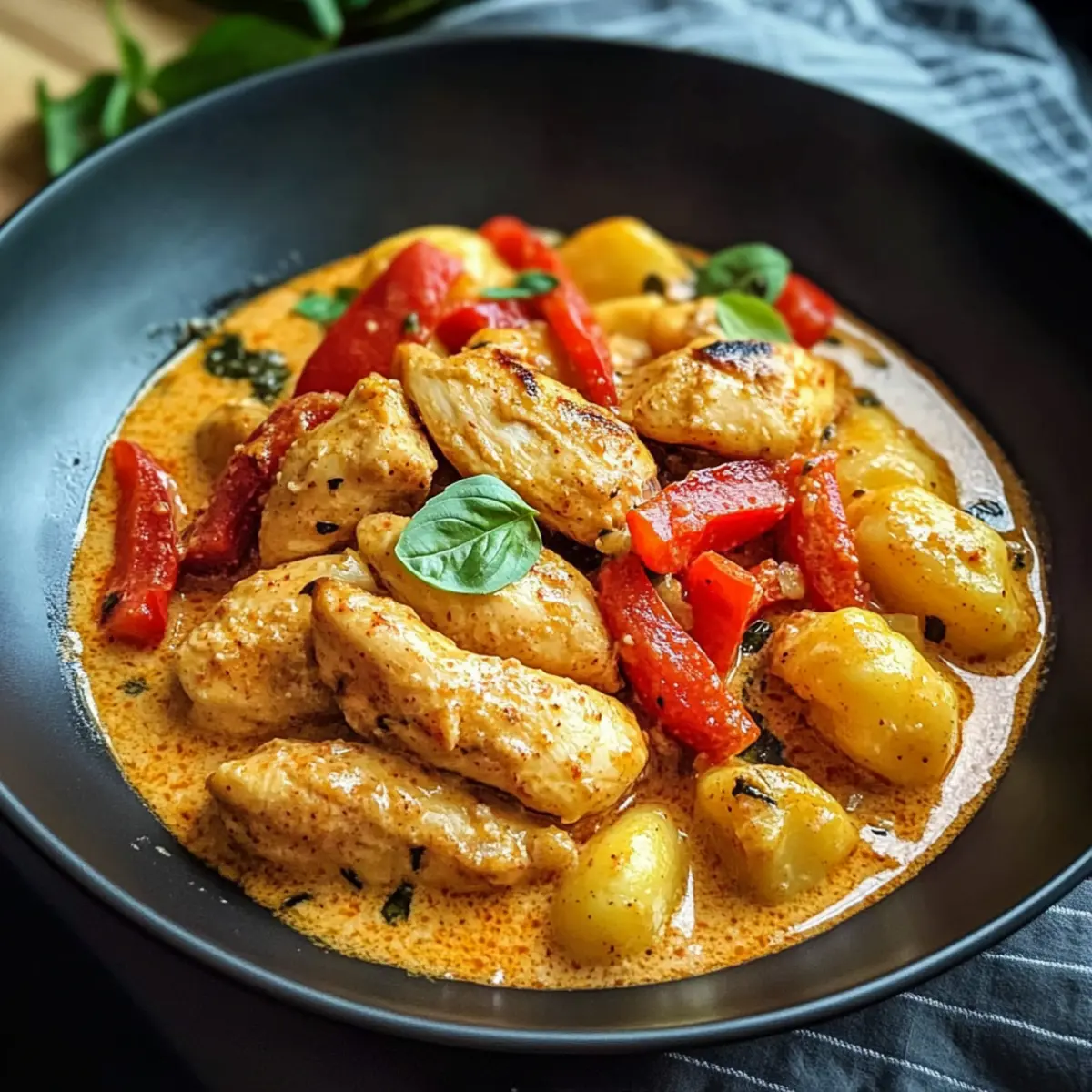 Vereine die Gnocchi in der Pfanne mit der Paprika-Creme-Sauce und dem Hähnchen oder serviere sie auf einem separaten Teller. Garnieren nach Belieben mit frischen Kräutern wie Petersilie oder Basilikum. Dieses Paprika-Creme-Hühnchen-Gericht ist eine wahre Genussreise und sollte sofort heiß serviert werden.