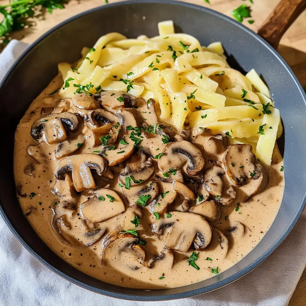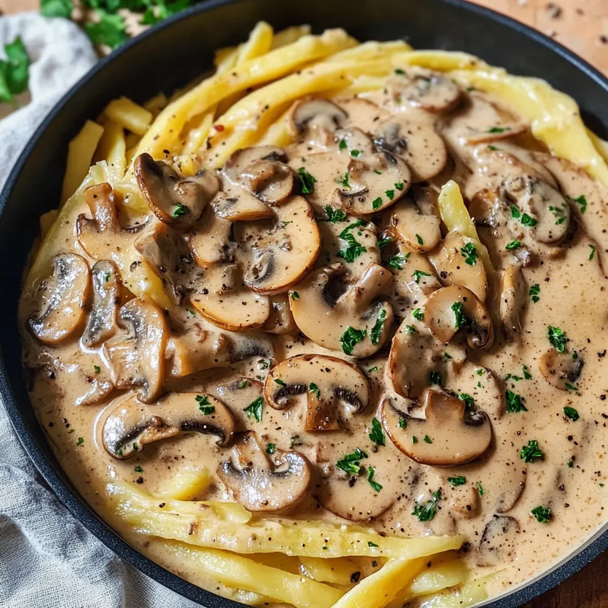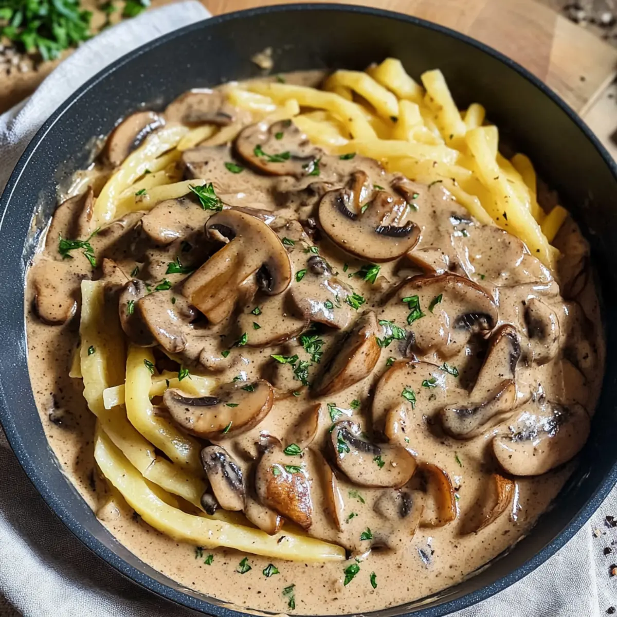 Pilzvielfalt: Tauschen Sie die braunen Champignons gegen shiitake oder pfifferlinge aus, um neue Geschmacksrichtungen zu erleben. Die Variation der Pilze bringt spannende Aromen in die Sauce.
