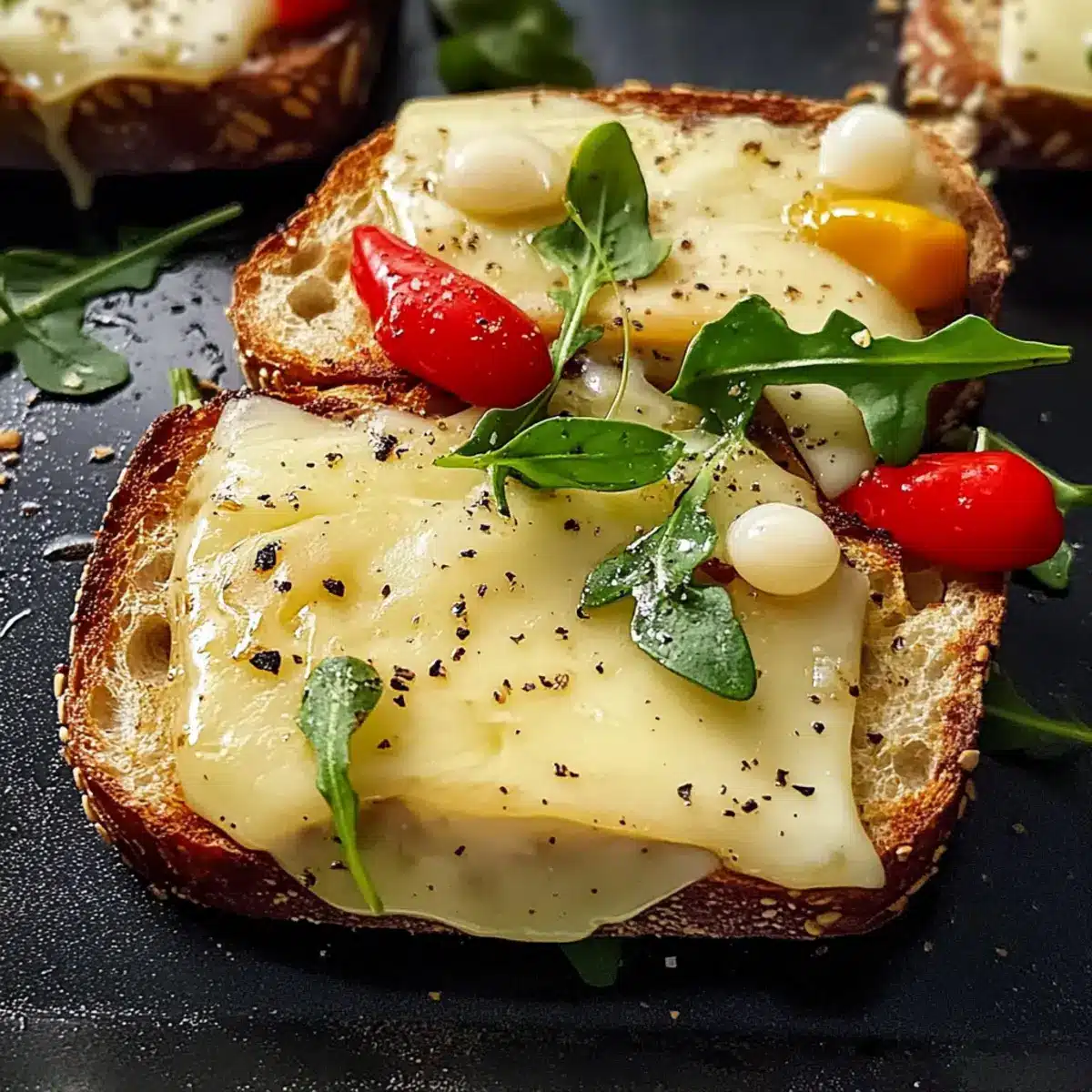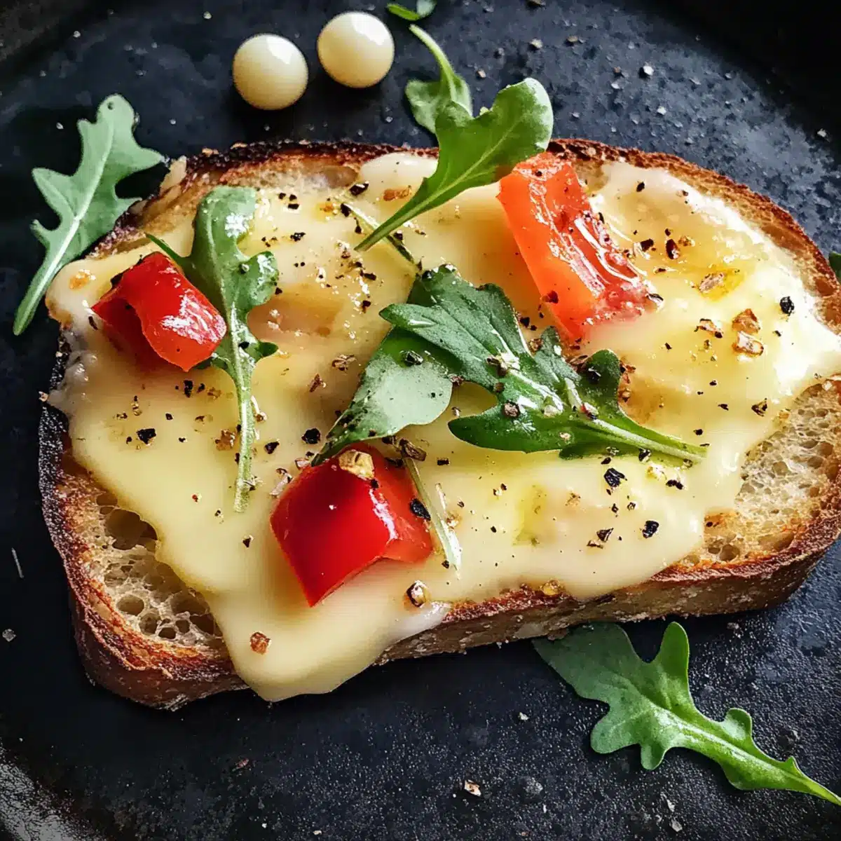 - Servieren Sie das Raclette-Brot heiß und garnieren Sie es mit Pfeffer und frischen Zutaten.