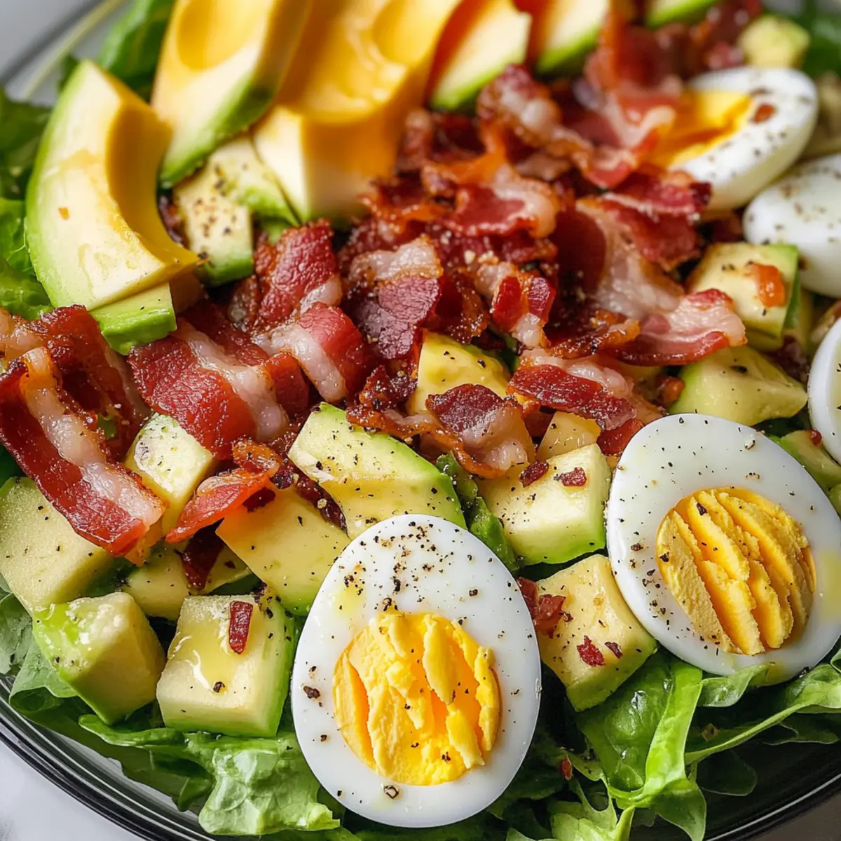 - Legen Sie die hartgekochten Eier in Scheiben und fügen Sie diese gleichmäßig über den Römersalat hinzu. Fügen Sie den gekochten Räucherspeck und die gewürfelte Avocado hinzu.