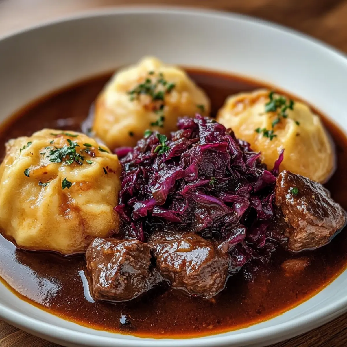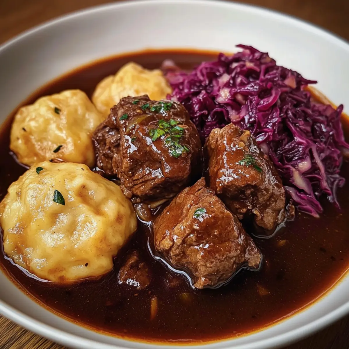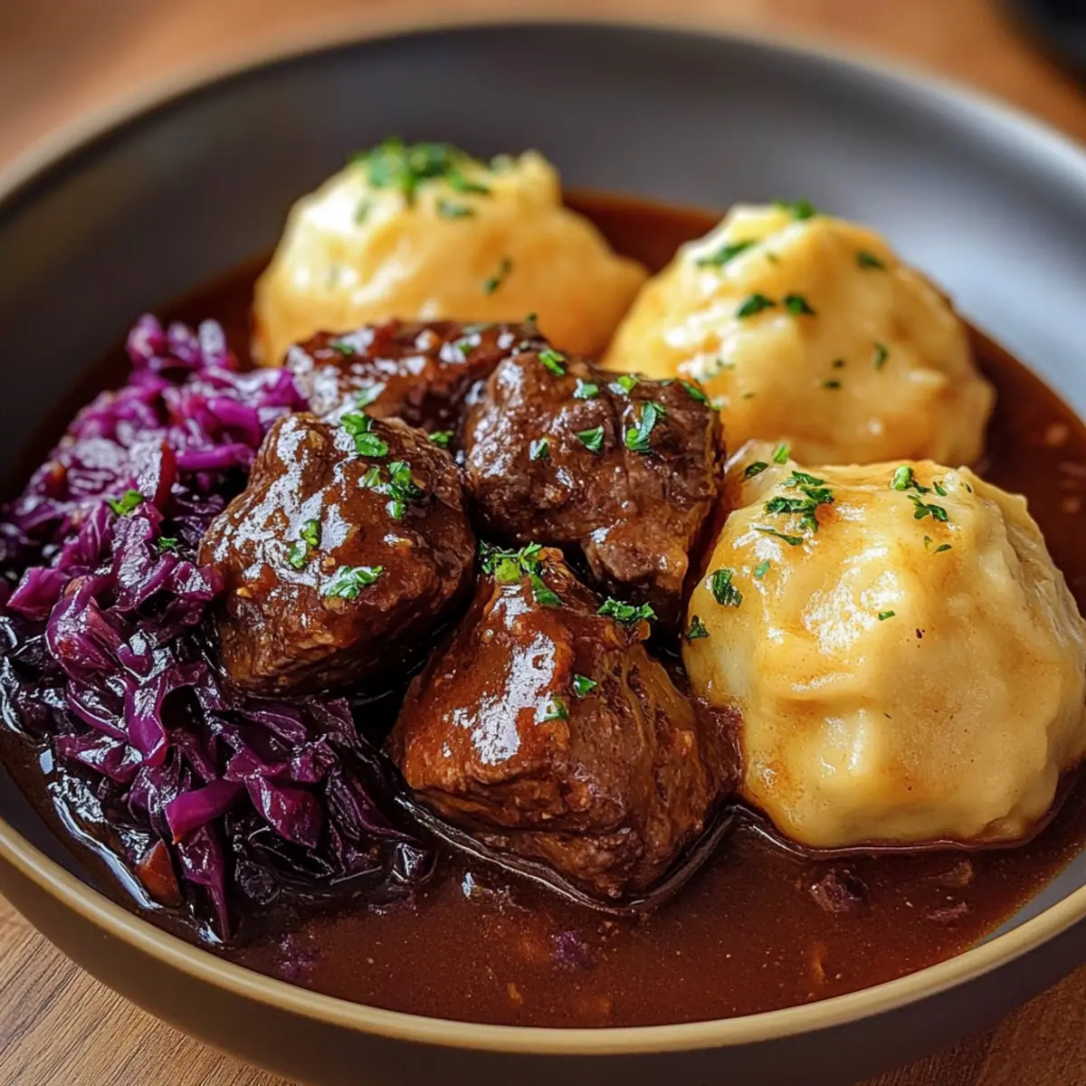 Bereiten Sie sich vor, diesen köstlichen Rinderschmorbraten mit Knödeln und Rotkohl zu genießen – ein wahres Festmahl der Deutschen Küche, das Ihnen viele Komplimente einbringen wird!