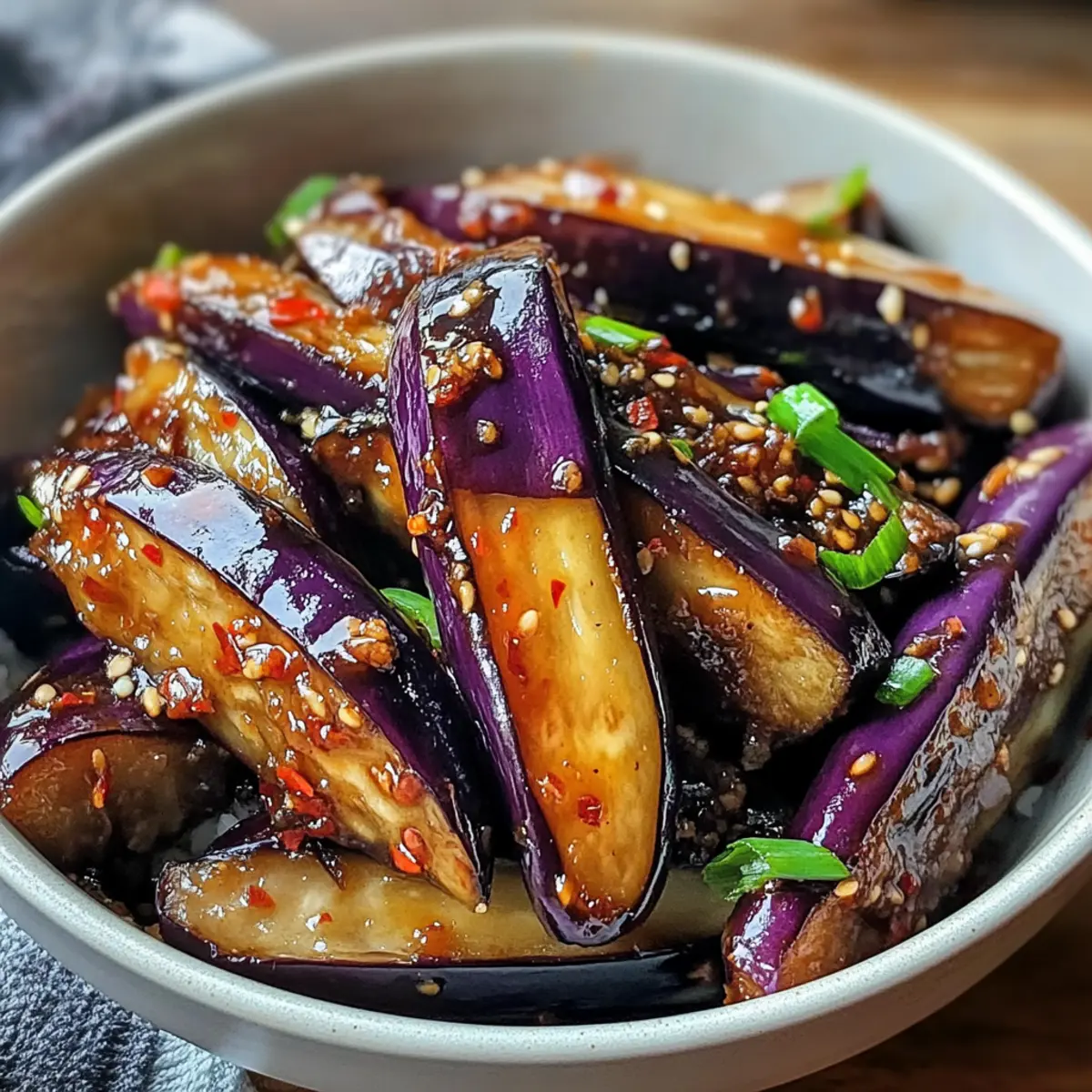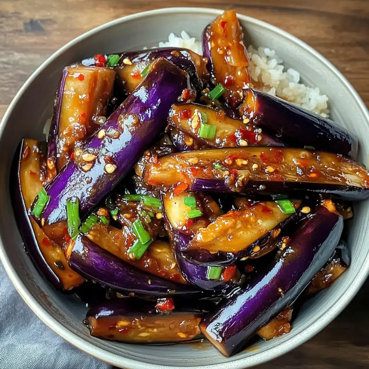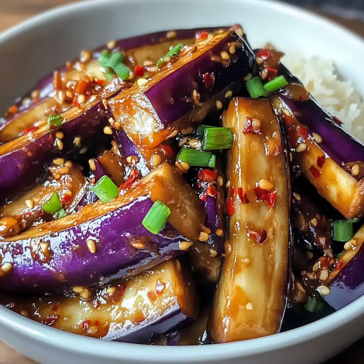 - Serviere die Sichuan-Aubergine heiß mit gedämpftem Reis oder asiatischen Nudeln.