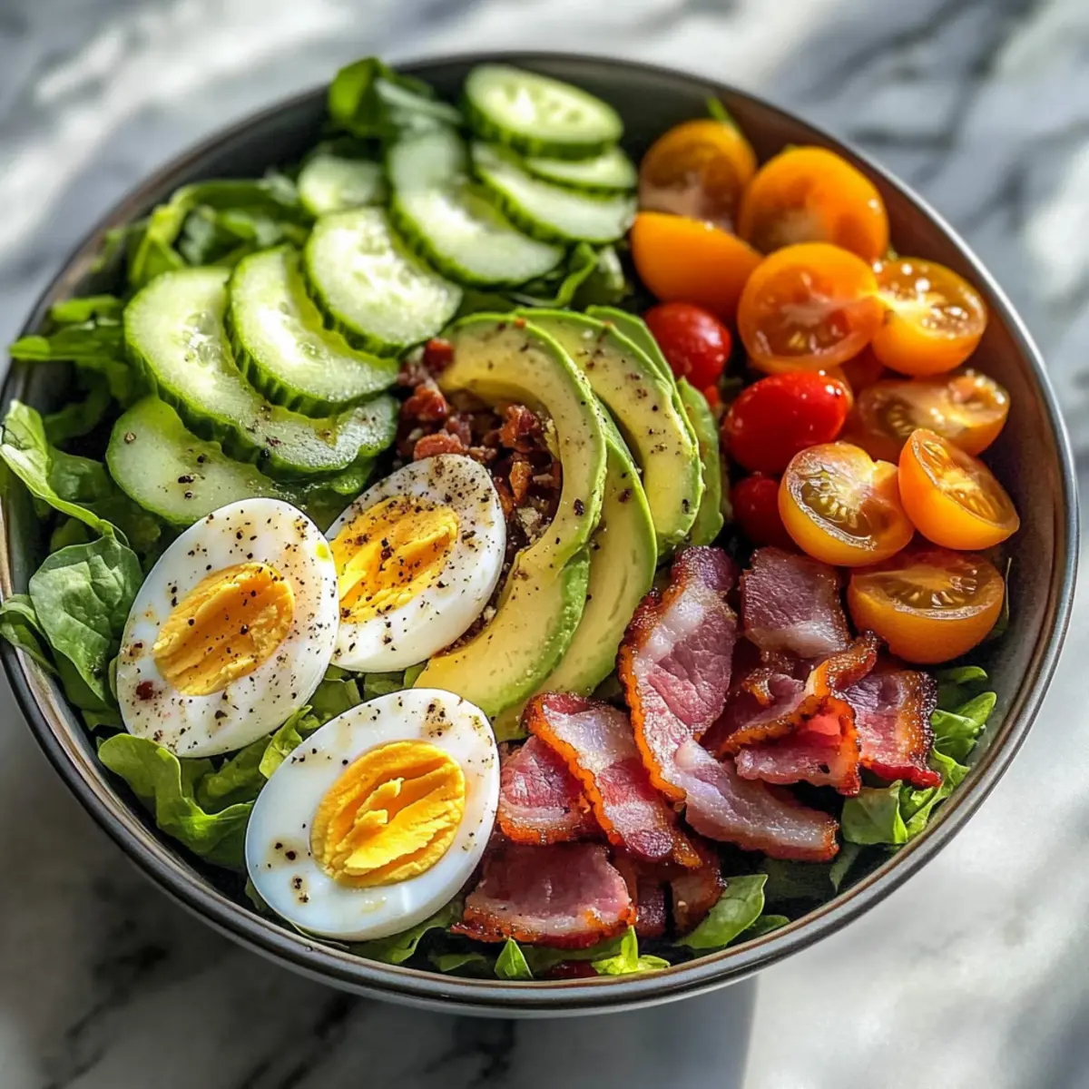 - In einer großen Schüssel die Blattsalate verteilen und Eier, Bacon, Kirschtomaten, Gurken und Avocado dekorativ darauf anrichten.