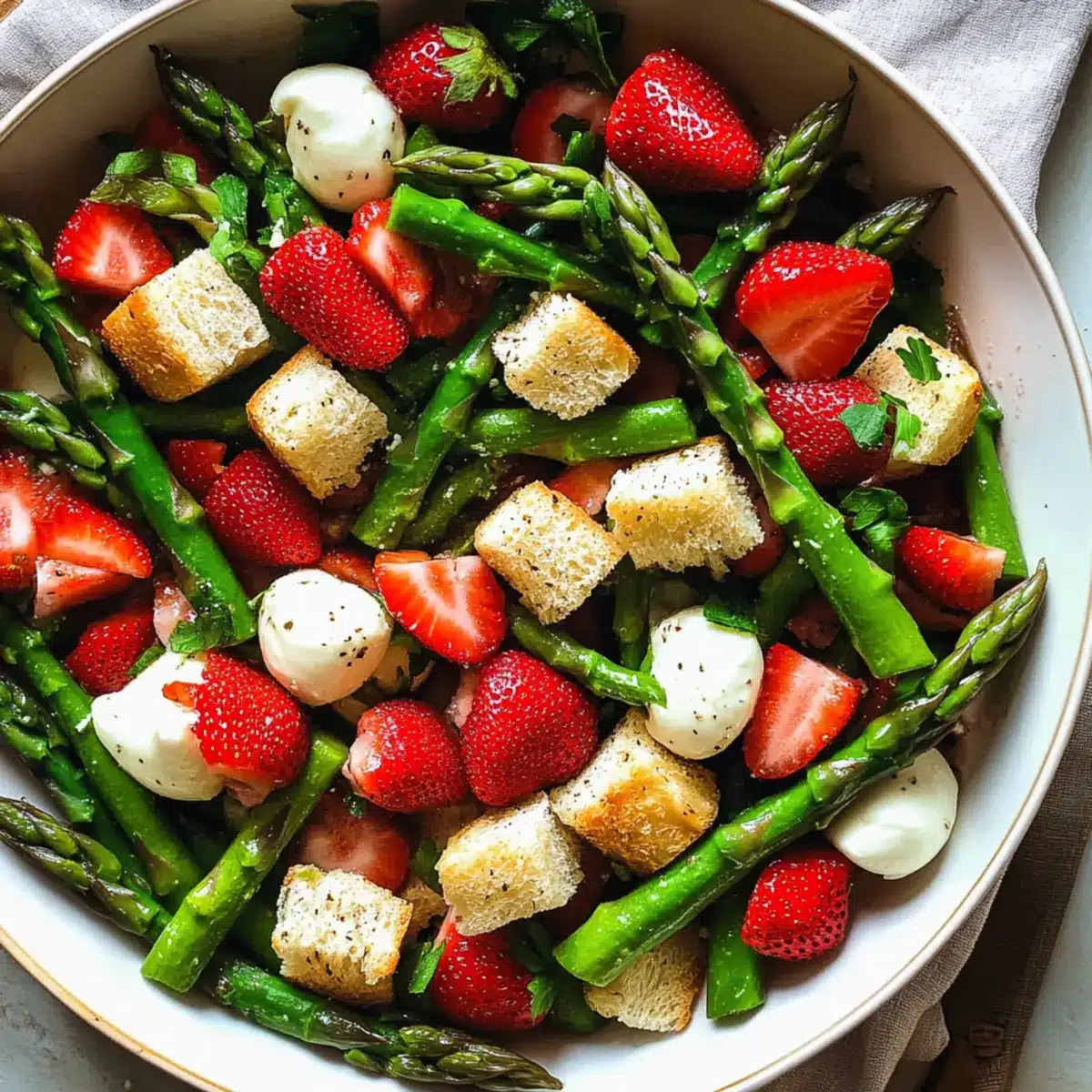 Frische Aromen: Dieser Spargelsalat mit Erdbeeren kombiniert die knackige Textur von grünem Spargel mit der Süße reifer Erdbeeren und der Cremigkeit von Mozzarella – ein Geschmackserlebnis!