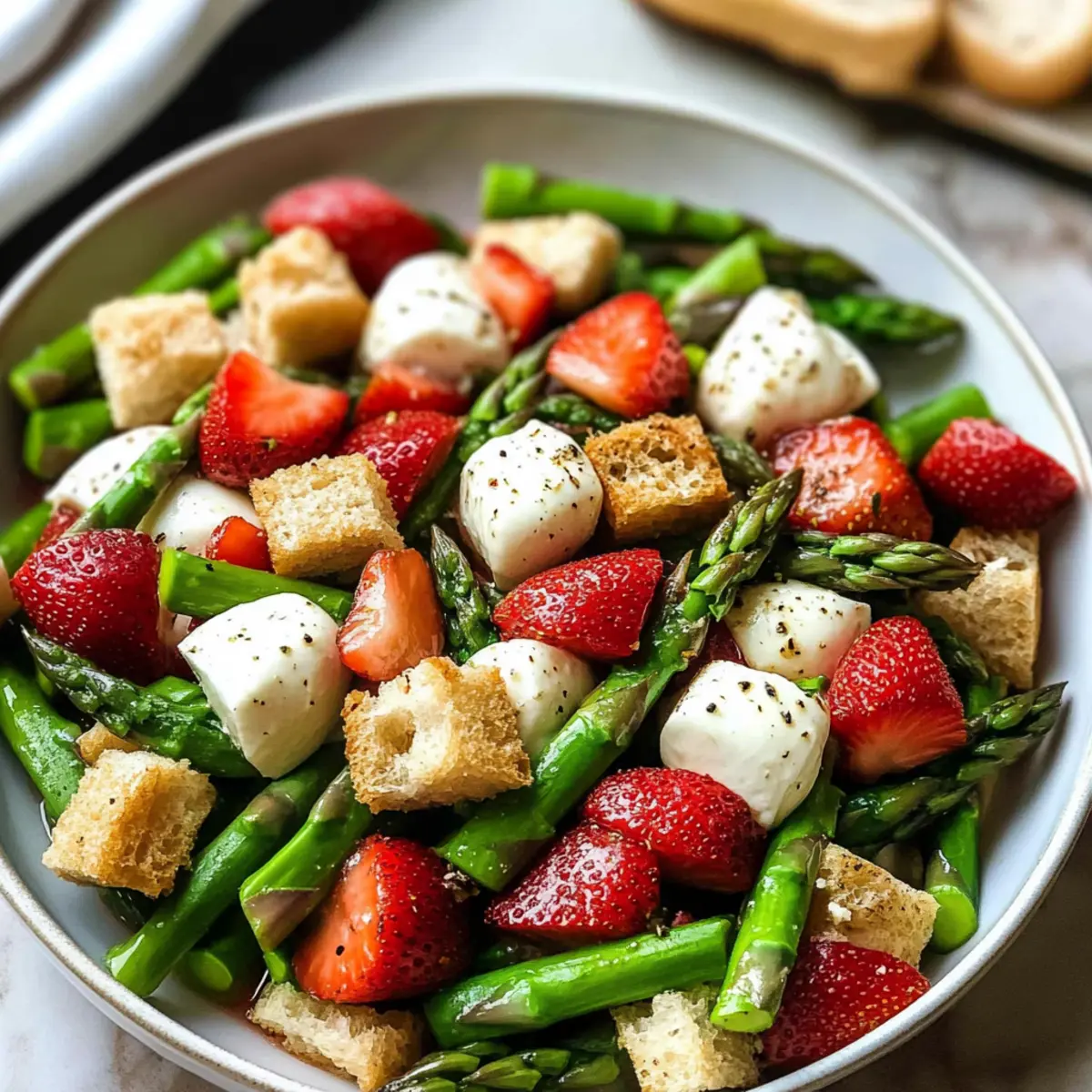 Nehme die Backform aus dem Ofen und lasse die Mischung kurz abkühlen. Vermenge dann in einer großen Schüssel den warmen Spargel, das knusprige Brot, den Babyspinat, die Pinienkerne, die Erdbeeren und die Mozzarella-Bällchen. Achte darauf, alles sorgfältig zu vermengen, damit sich die Aromen gut verteilen.