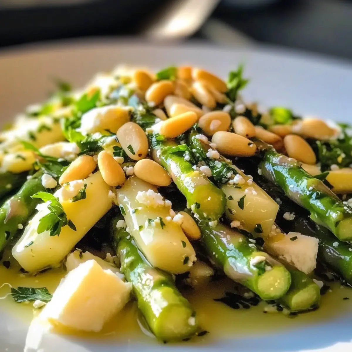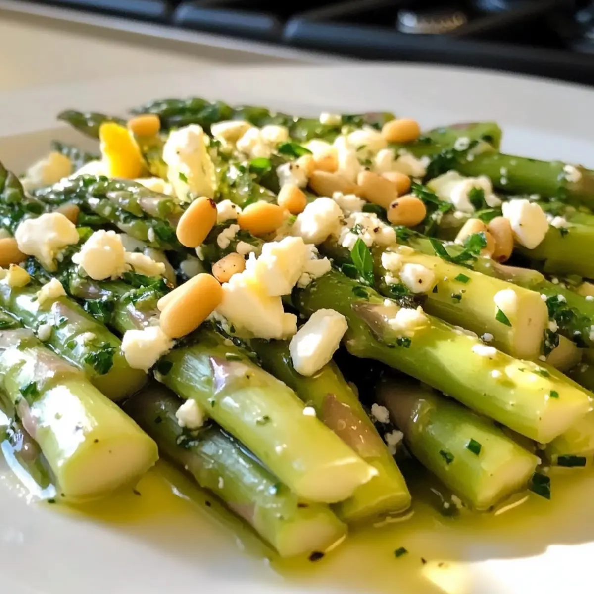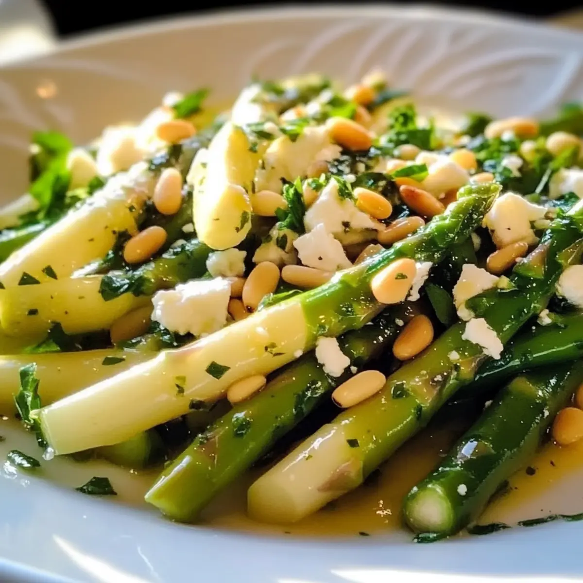 - Gebt den zubereiteten Spargelsalat in eine Servierschüssel und garniert ihn nach Belieben mit gerösteten Pinienkernen und zerbröseltem Feta-Käse. Serviert ihn sofort.