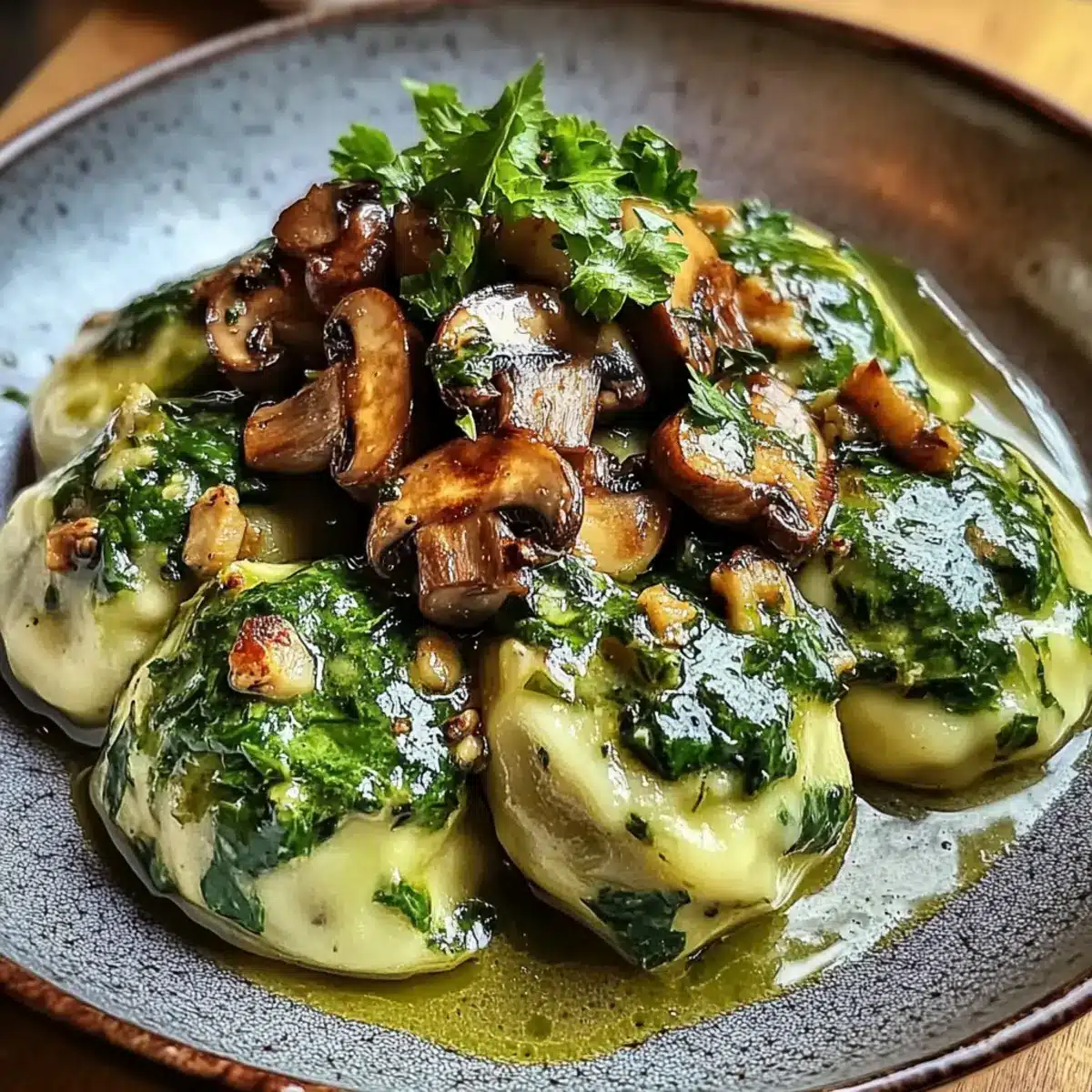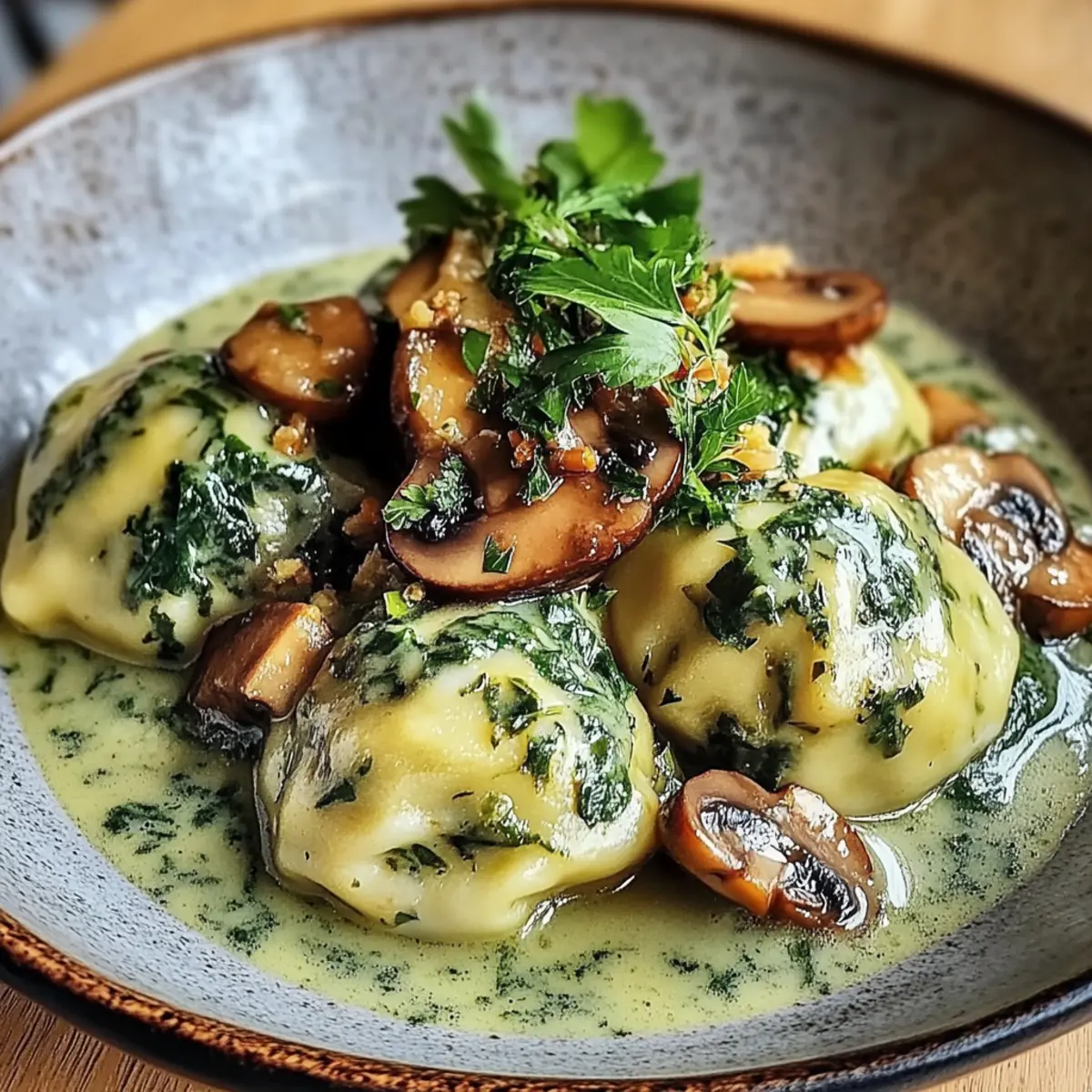 - Platziere die Spinatknödel auf Tellern und schöpfe das cremige Pilzragout darüber, sodass jeder Bissen ausreichend überzogen ist.