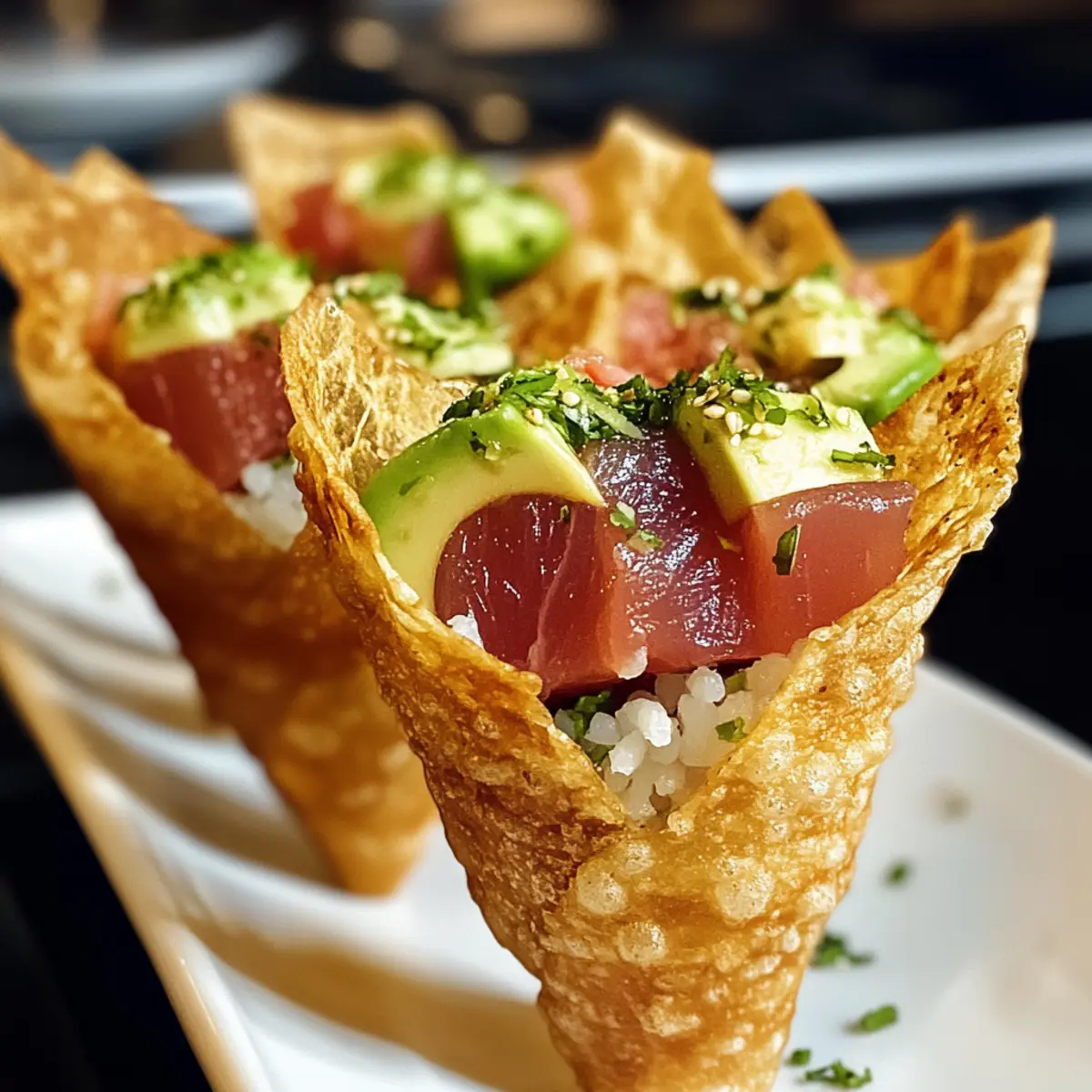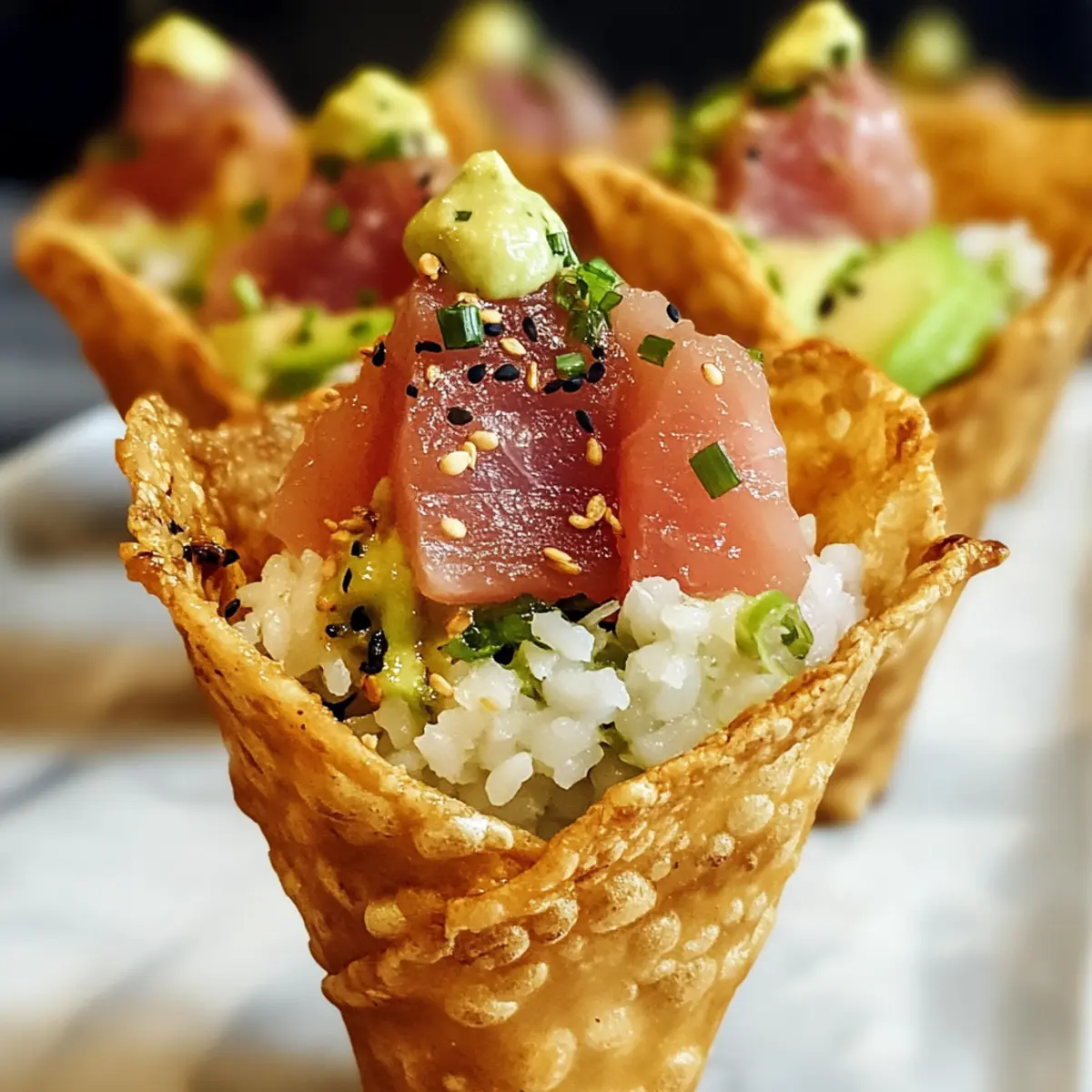 Nimm die abgekühlten Wonton-Tüten und fülle sie mit einer Schicht Sushi-Reis, gefolgt von Avocadoscheiben und einer großzügigen Portion der Thunfischmischung. Achte darauf, die Tüten nicht zu überladen, sodass sie leicht zu essen sind und ihre Form behalten.