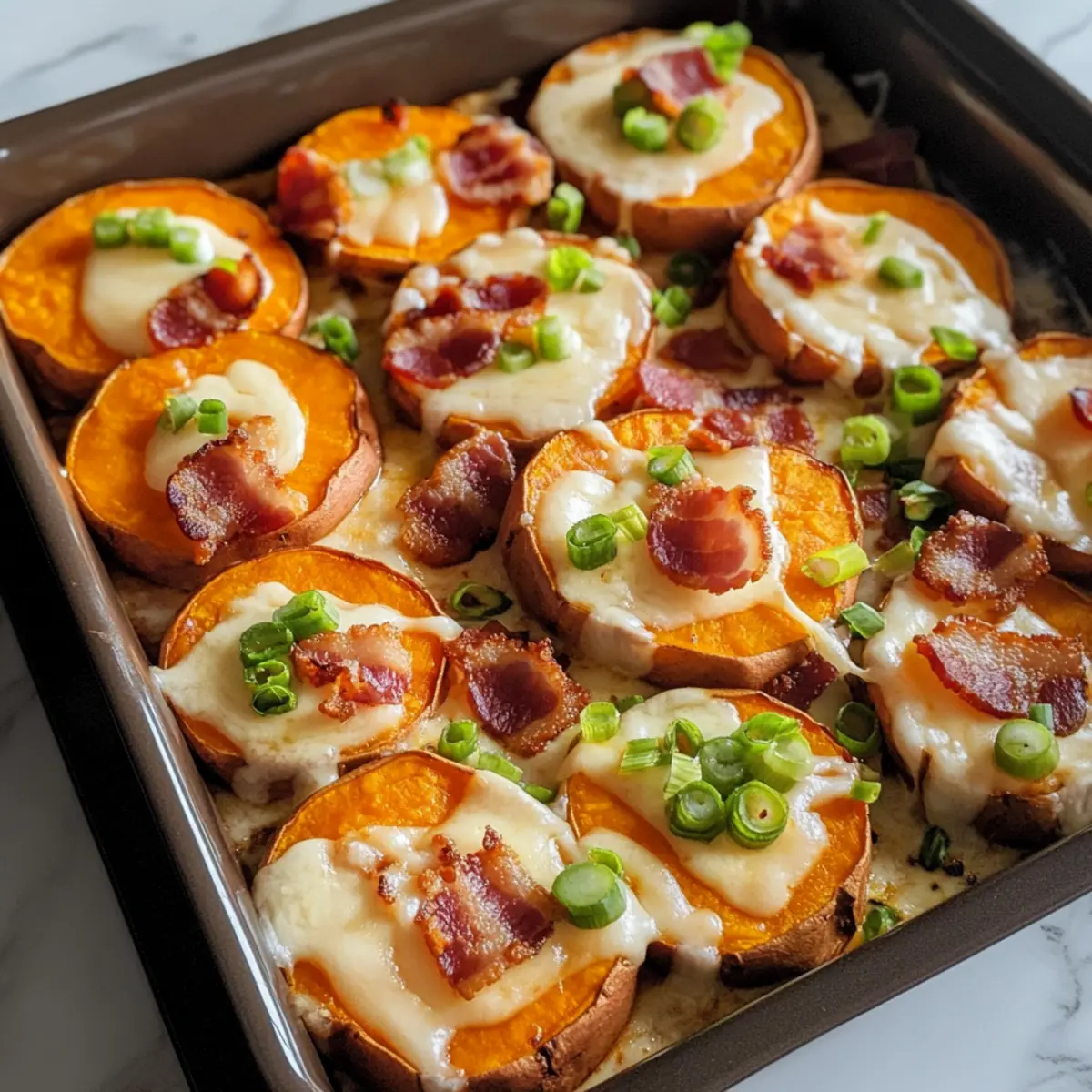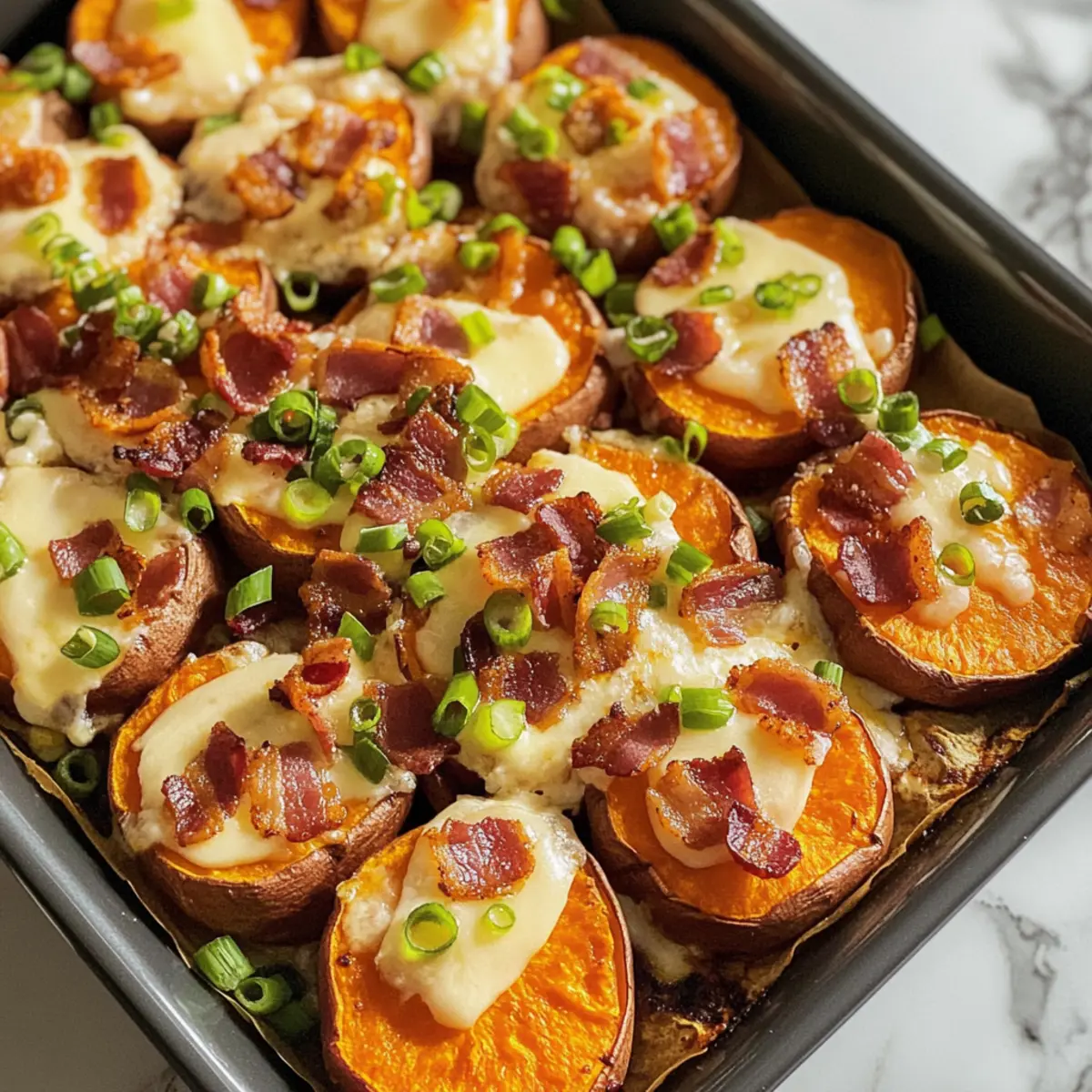 - Geriebenen Cheddar-Käse und zerbröckelten Bacon gleichmäßig über die Süßkartoffeln verteilen.